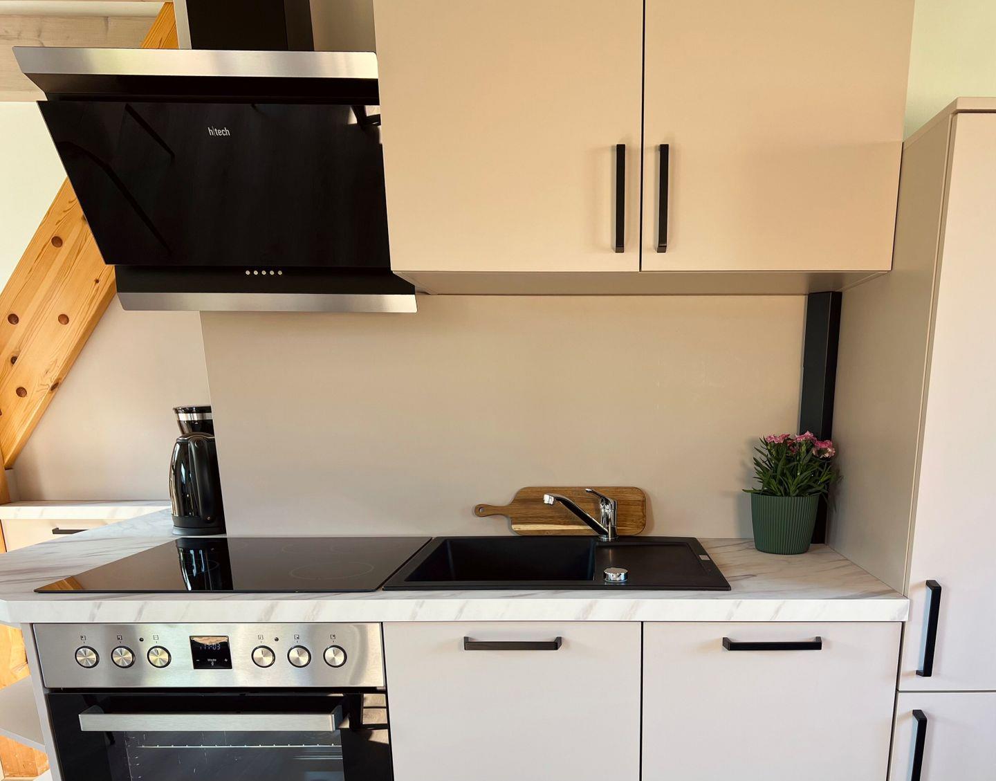 KÜCHE // offene Küche, 4-Plattenherd, Kühlschrank mit Gefrierfach, Backofen, Toaster, Wasserkocher, Kaffeemaschine, reichlich Besteck, Geschirr und Küchenutensilien ++