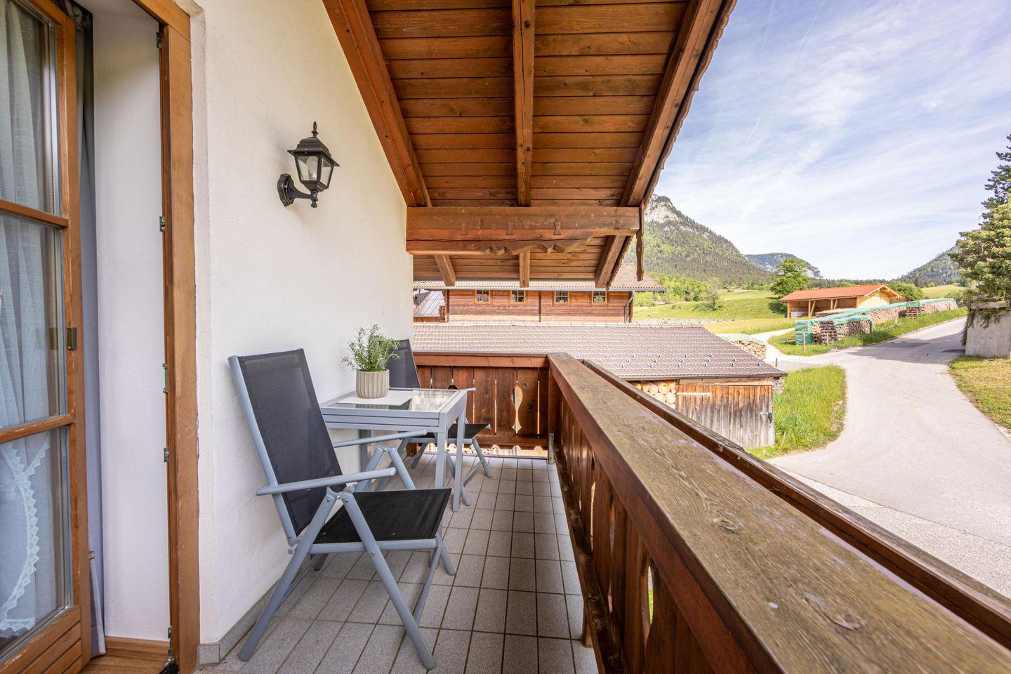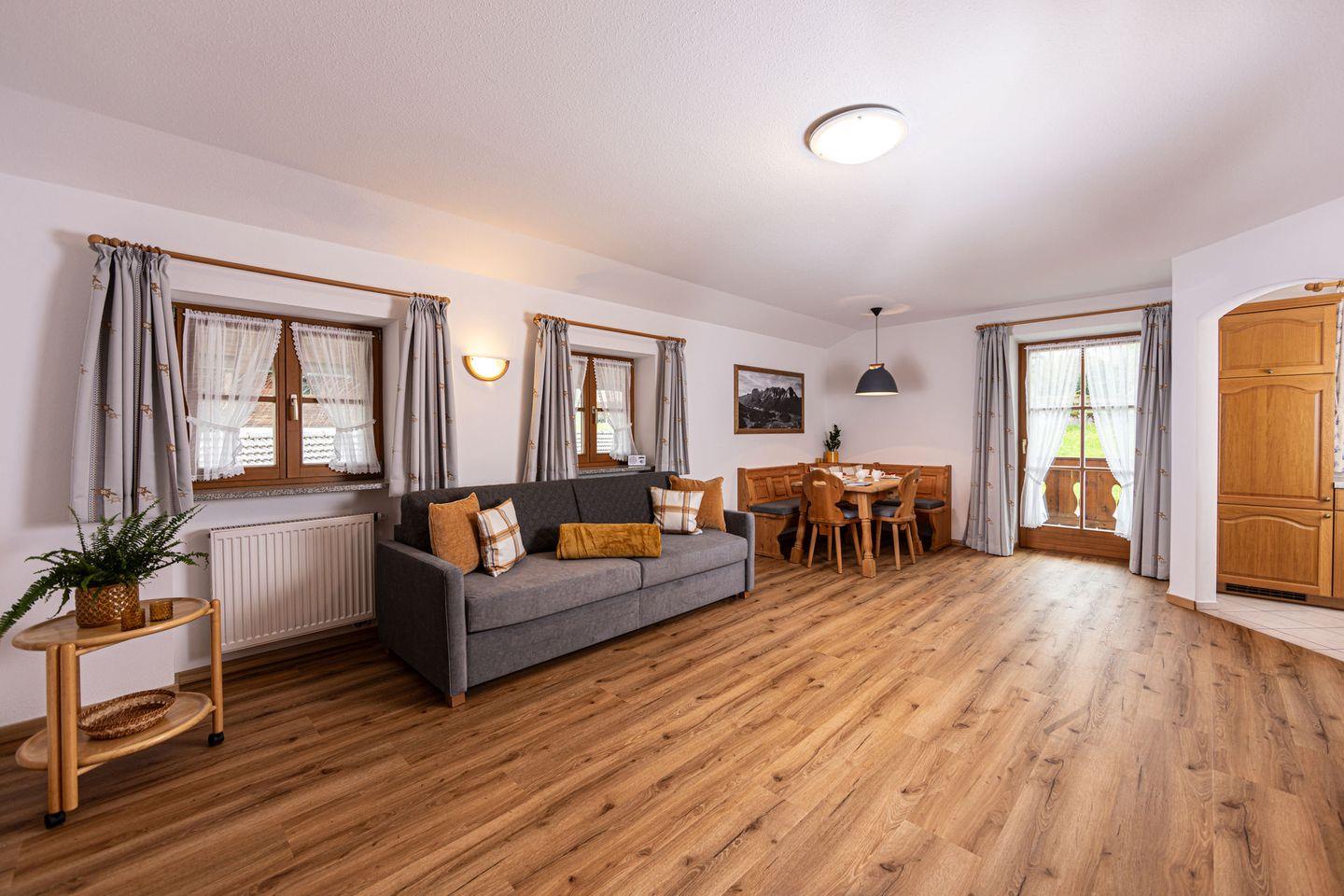 Diese liebevoll eingerichtete Ferienwohnung ist ideal für Familien, Paare und Naturliebhaber, die eine unvergessliche Zeit in den Bergen verbringen möchten. Mit einer Größe von 50 m² bietet die Wohnung ausreichend Platz für bis zu vier Personen. Die gepflegte Unterkunft verfügt über ein Schlafzimmer mit Doppelbett. Der Wohnbereich mit Schlafsofa und Essbereich lädt zum entspannten Verweilen ein. Die offene Küche, die zum Wohnzimmer hin gestaltet ist, ist mit allen notwendigen Küchenutensilien ausgestattet. Dazu gehören ein 4-Platten-Herd mit Elektrobackofen, ein Kühlschrank mit Gefrierfach, Kaffeemaschine, Wasserkocher und Toaster. Ein weiteres Highlight der Ferienwohnung ist der überdachte Balkon, der einen wunderbaren Blick auf die umliegenden Berge bietet. Hier können Sie bei einem Glas Wein entspannen oder die frische Bergluft genießen. Das Badezimmer ist mit einer Dusche, einem WC, einem Waschbecken und einem Haartrockner ausgestattet. WLAN und Parkplatz stehen kostenfrei zur Verfügung.