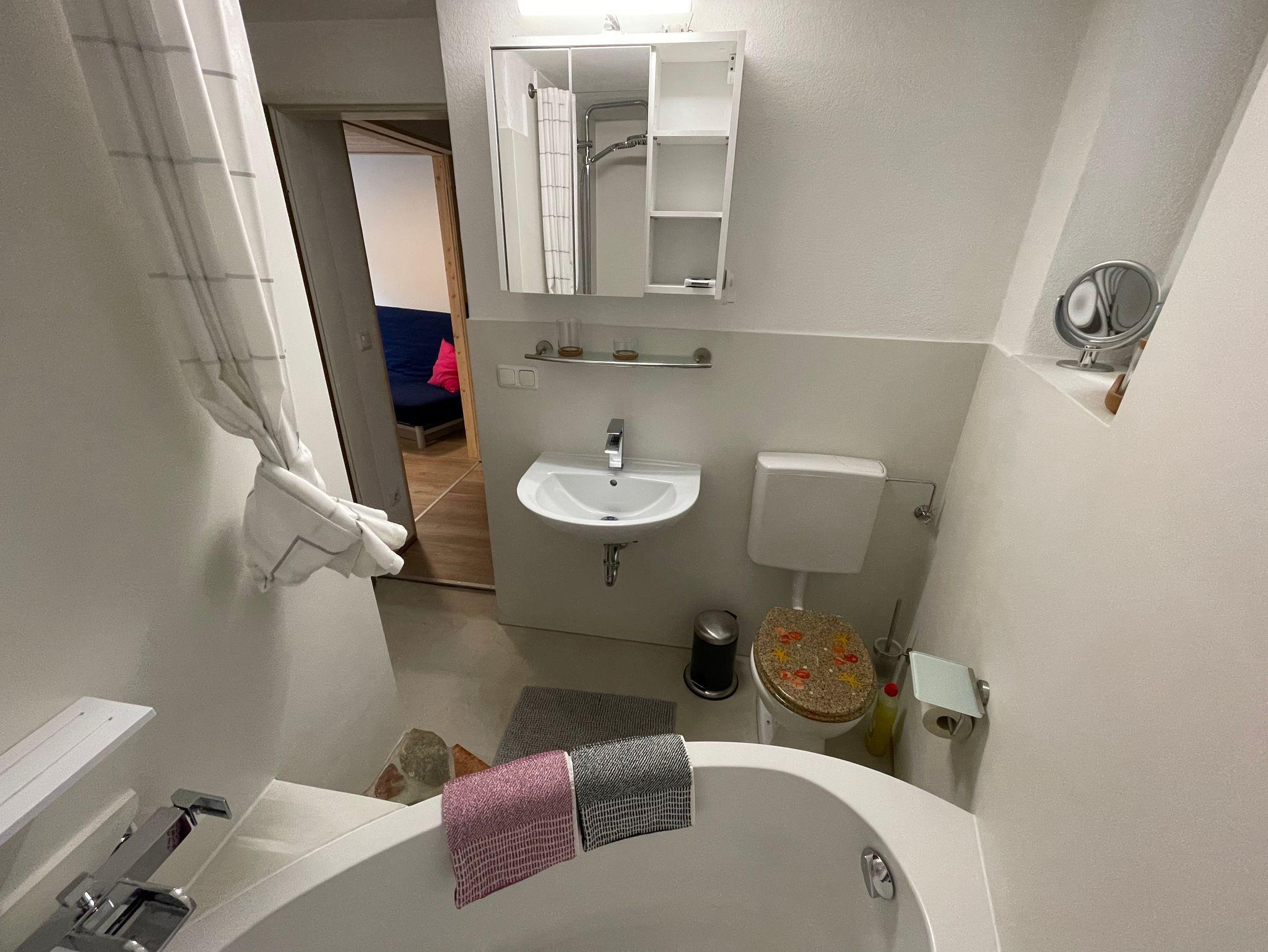 Unsere schöne Ferienwohnung hat einen eigenen Eingangsbereich mit Garderobe. Die Wohnung verfügt über 2 Betten, die liegen im Schlafzimmer (160x200) und im Wohnbereich (140x200). Das Badezimmer ist ausgestattet mit einer Badewanne und einer integrierten Regendusche. Die Küche hat eine Grundausstattung mit Herd, Wasserkocher, Kaffeemaschine, Toaster, Mikrowelle mit Grillfunktion, großer Kühlschrank mit Gefrierfach und Spülmaschine. Im Wohnbereich finden Sie eine Schlafcouch und einen Flachbildfernseher. Die Ferienwohung verfügt über kostenloses WLAN.