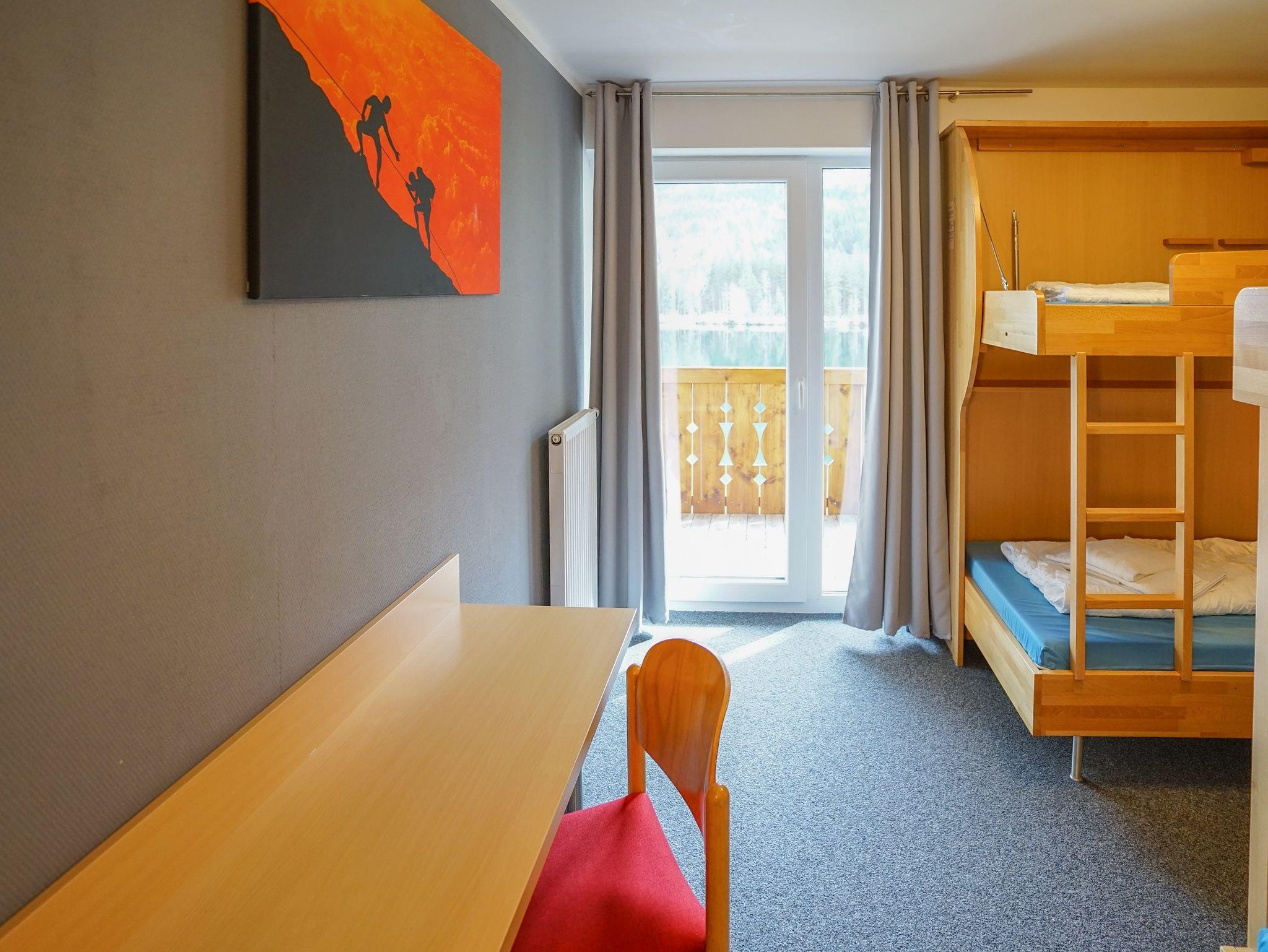 Gemütlich und modern eingerichtetes Mehrbettzimmer mit Doppelstockbetten und einem traumhaften Blick auf den Hintersee und das Hochkaltermassiv ühstücksbuffet, Handtüchern und Bettwäsche. Bei einem Aufenthalt von mindestens 3 Nächten ist zudem Ihr Bett bei Anreise bereits bezogen. Ab einem Aufenthalt von mindestens 7 Nächten ist zudem eine Zimmerreinigung und ein Handtuchwechsel inklusive.