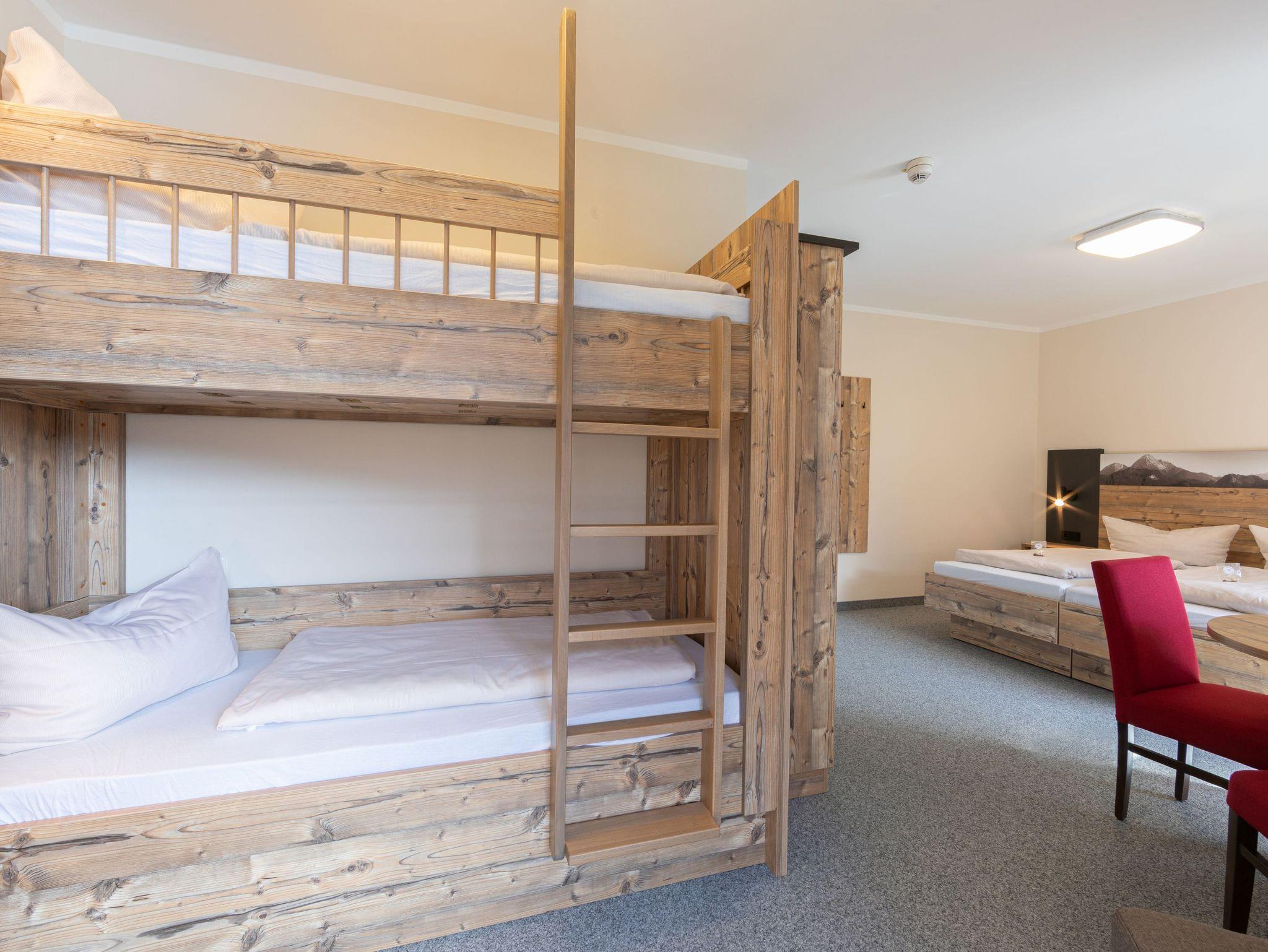 Gemütlich eingerichtetes Familienzimmer mit einem traumhaften Blick auf den Hintersee und das Hochkaltermassiv inkl. Frühstücksbuffet, Bettwäsche und Handtücher. Ab einem Mindestaufenthalt von 3 Nächten sind Ihre Betten bei Anreise bereits bezogen. Ab einem Aufenthalt von 7 Nächten ist zudem eine Zimmerreinigung und ein Handtuchwechsel inklusive. Die Belegung mit einer fünften Person im Beistellbett ist auf Nachfrage eventuell möglich.