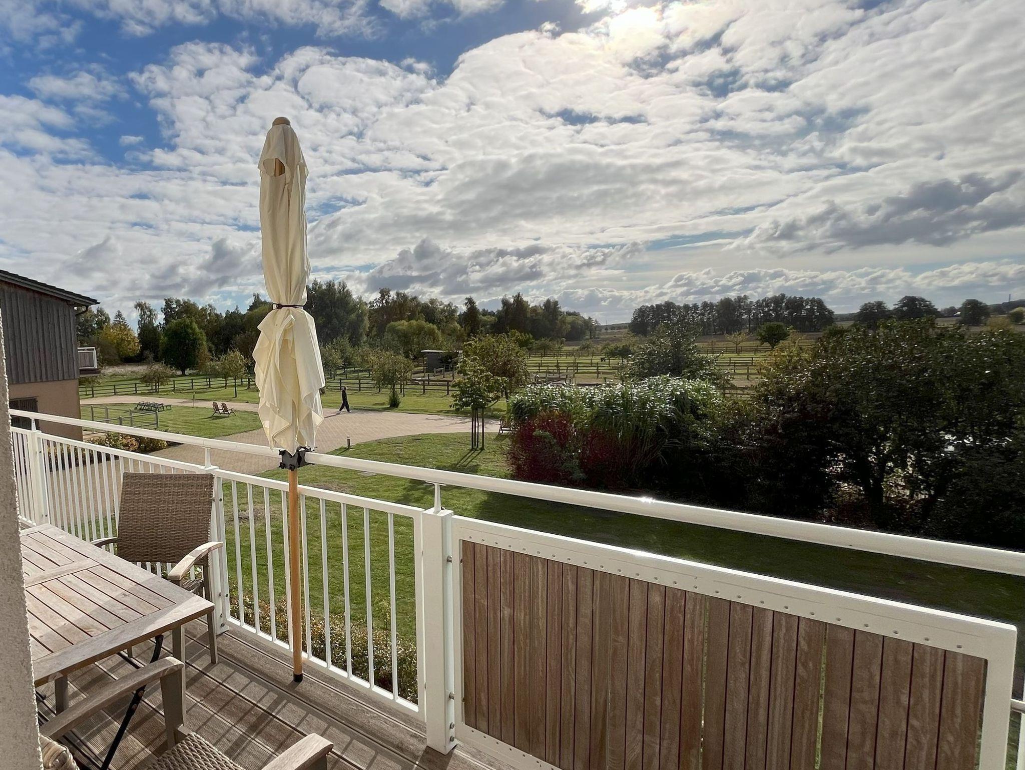 • Balkon mit Ausblick: Vom Wohnbereich gelangen Sie auf einen Balkon mit herrlichem Blick über die parkähnliche Gartenanlage und die umliegenden Felder.