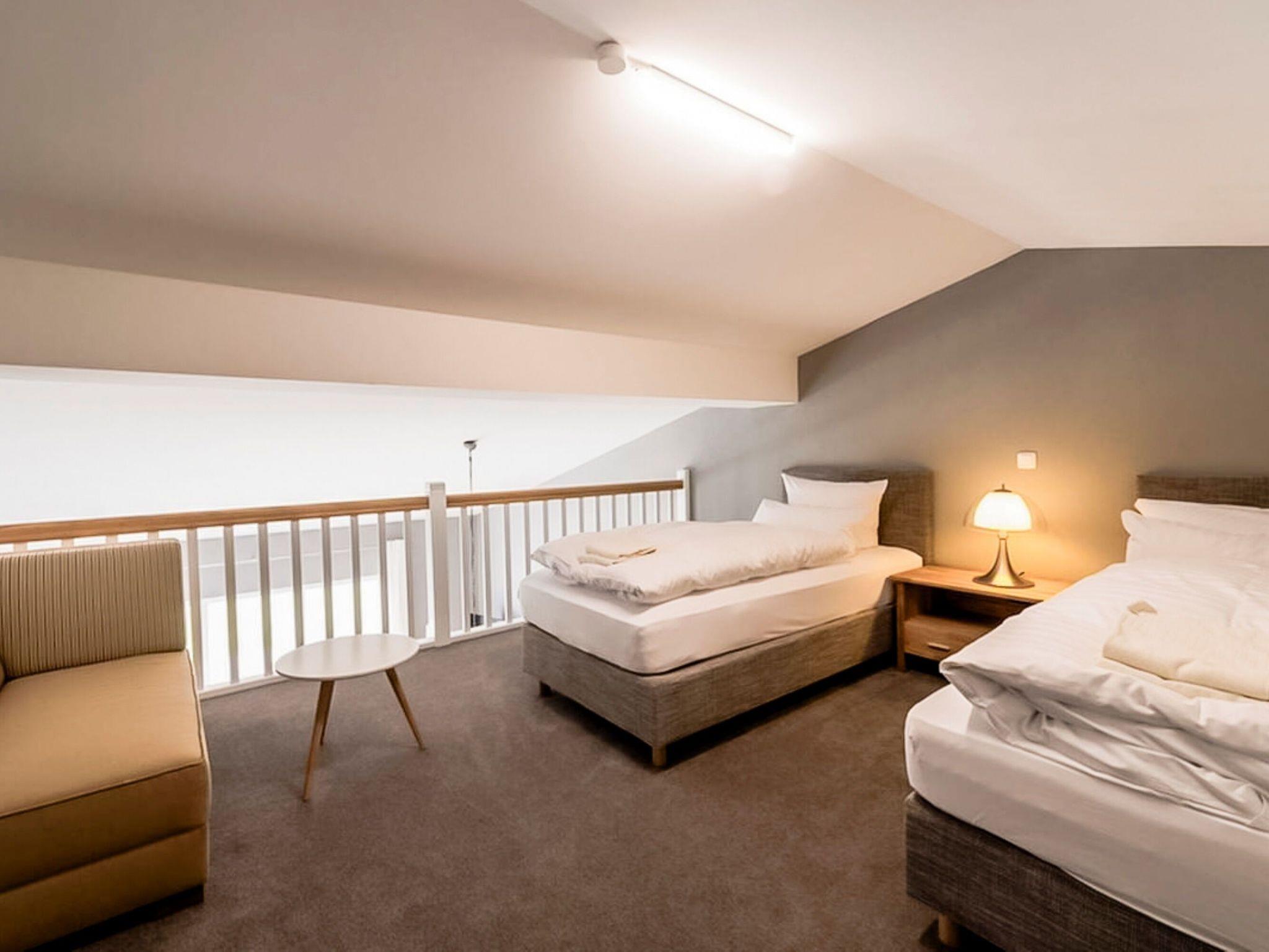 • Eine offene Schlafgalerie mit zwei Einzel-Boxspringbetten, die auch zusammengeschoben werden können