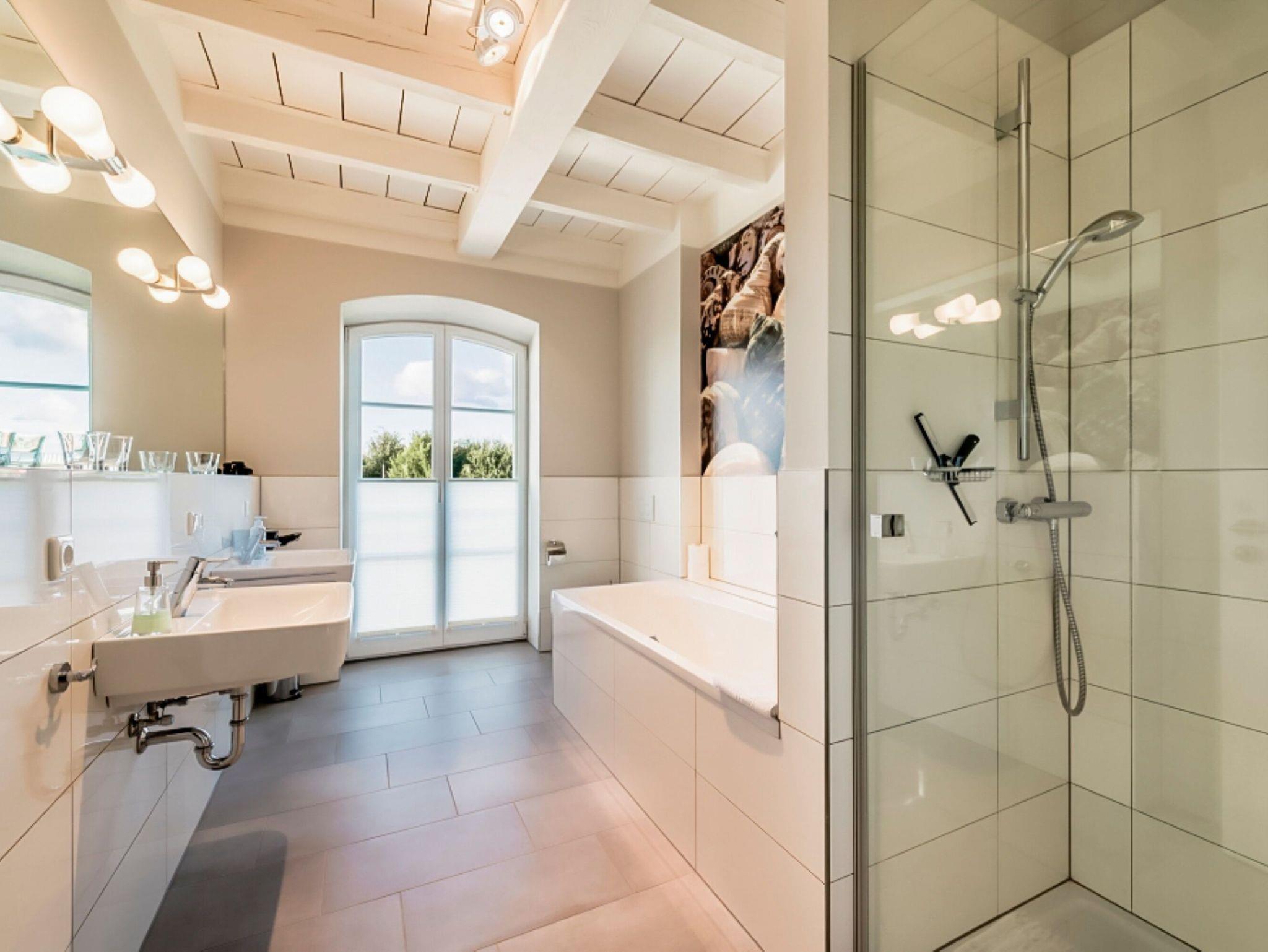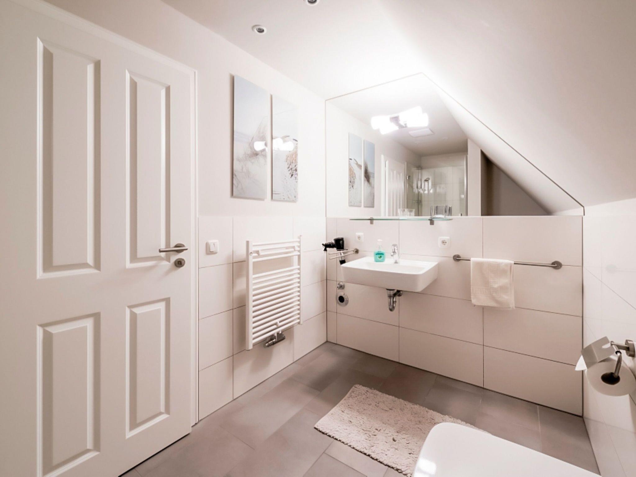 Für noch mehr Platz und Komfort können Sie die Mastersuite im Dachgeschoss hinzubuchen. Diese bietet ein drittes Schlafzimmer mit Boxspringbett und ein weiteres hochwertiges Badezimmer mit Dusche und WC. Preis: 30 € pro Tag. Der Zugang erfolgt bequem über eine Treppe innerhalb der Wohnung.