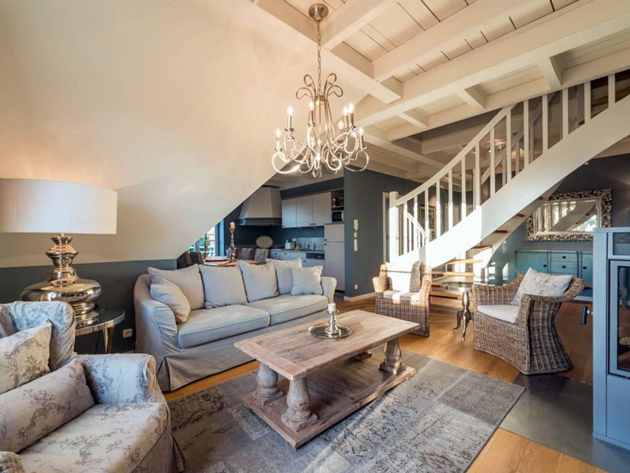 • Wohnzimmer im Landhausstil: Genießen Sie den Holzdielenboden, die behagliche Fußbodenheizung und einen gemütlichen Sitzbereich mit Kamin und TV-Flatscreen der perfekte Ort zum Entspannen.