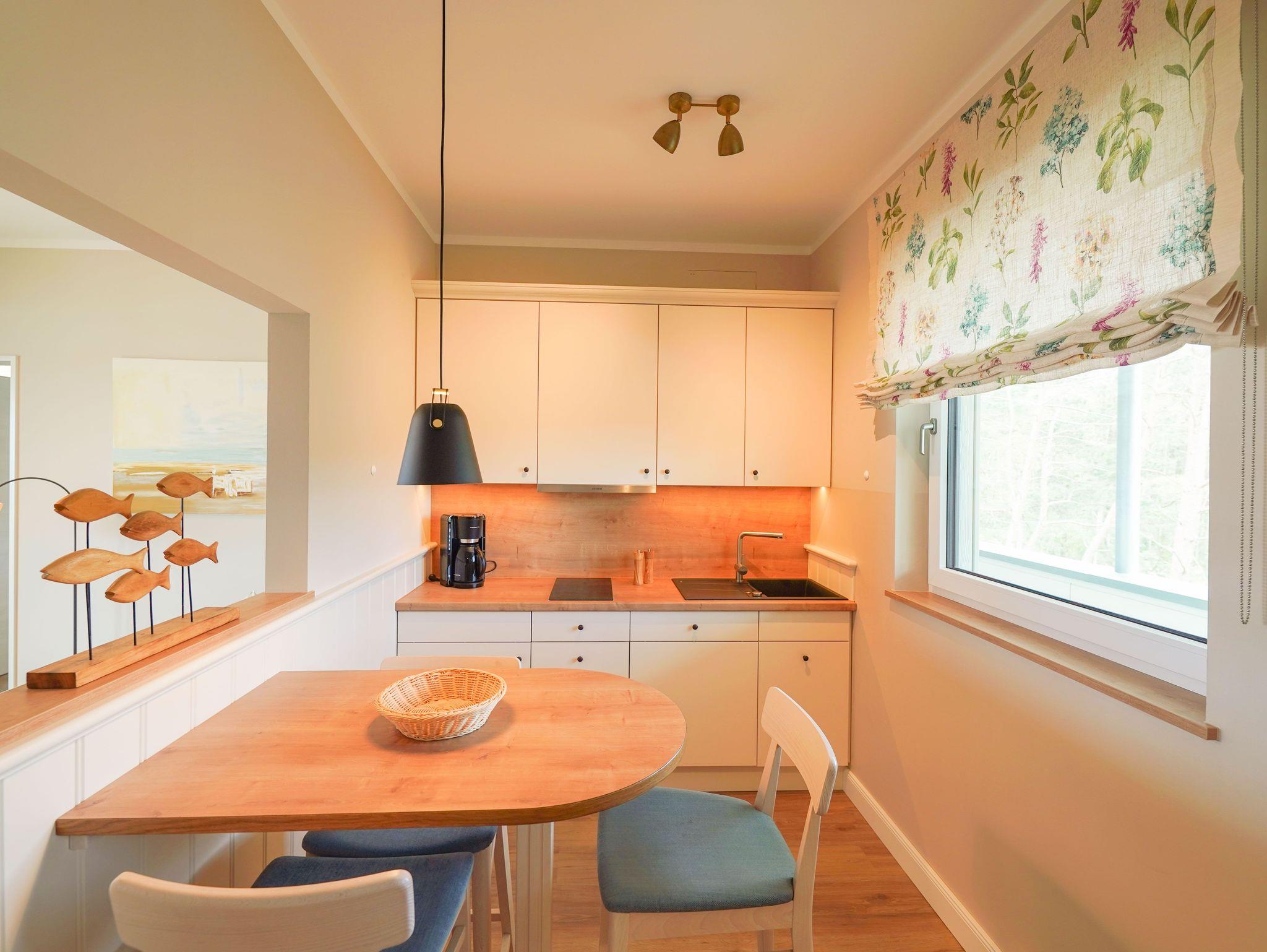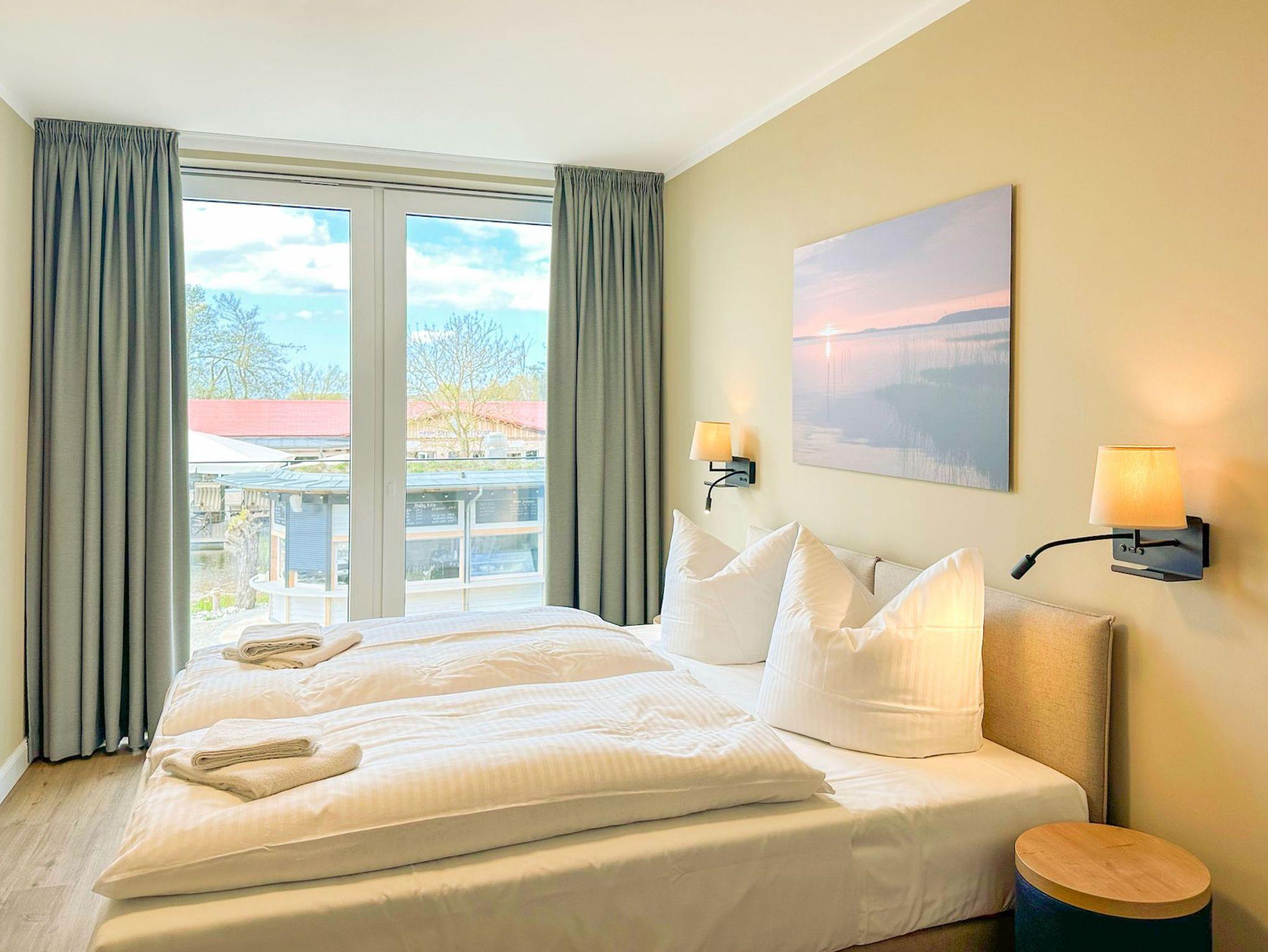 65m² Suite im OG für bis zu 3 Personen. 2 Schlafzimmer: 1 Doppel-Boxspringbett (180x200), 1 Einzelboxspringbett. Voll-ausgestattete 2-Stellen Kochfeld Küche. 15 m² Balkon mit einmaligem Blick auf Wasser und Hafen. Parkplatz und WLAN sind inklusive. Nichtraucher-Suite. Dachsauna mit Terrasse, Fitnessraum und Frühstück sind vor Ort zu buchbar. Wäschepaket und Endreinigung einmalig 139,- €.