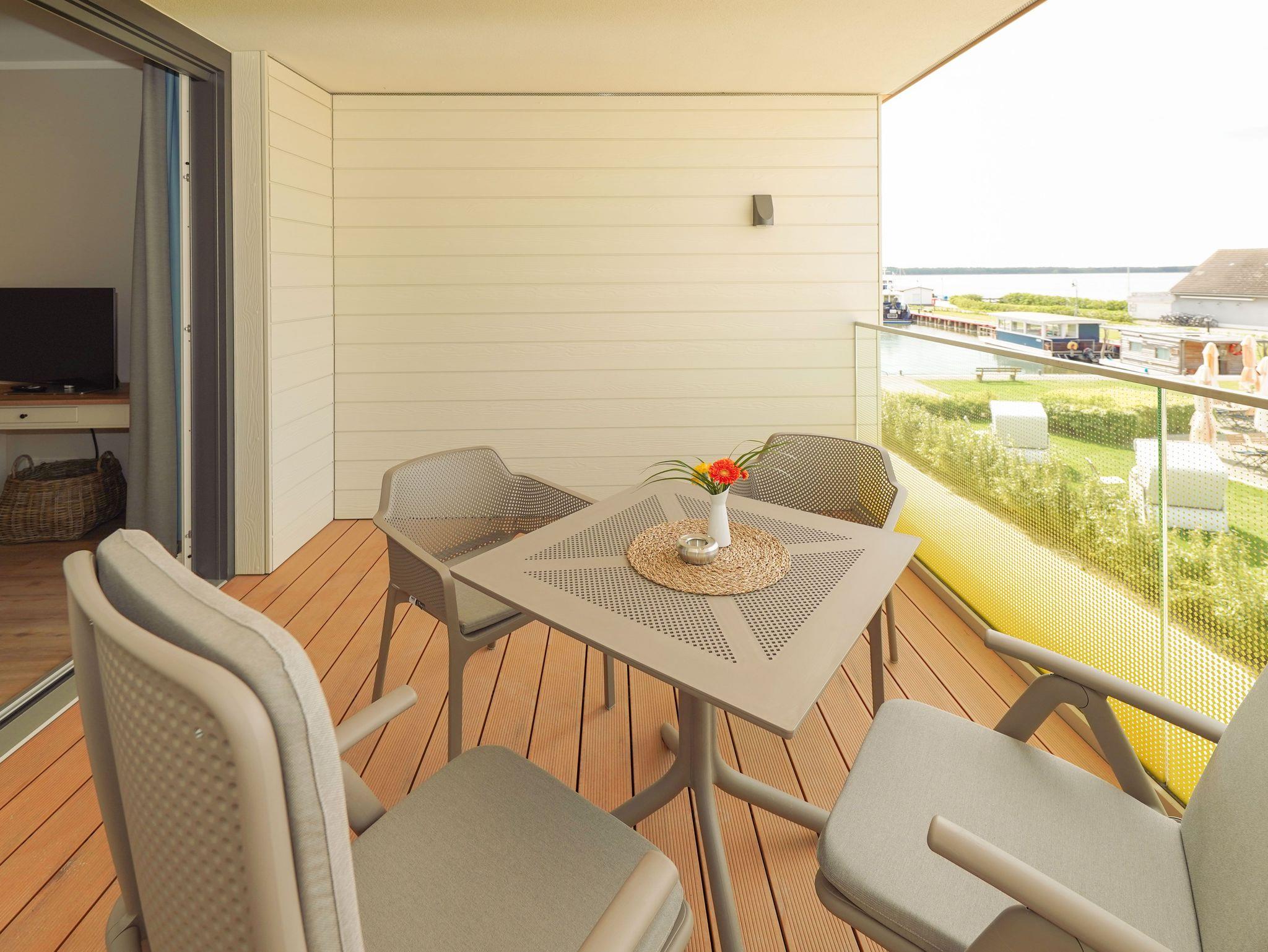 Die Strand Suite, die meiste Zeit werden Sie wahrscheinlich auf dem Balkon verbringen ? beim Ausblick auf das Wasser und schauen in erster Reihe dem entspannten Treiben im idyllischen Hafen zu.