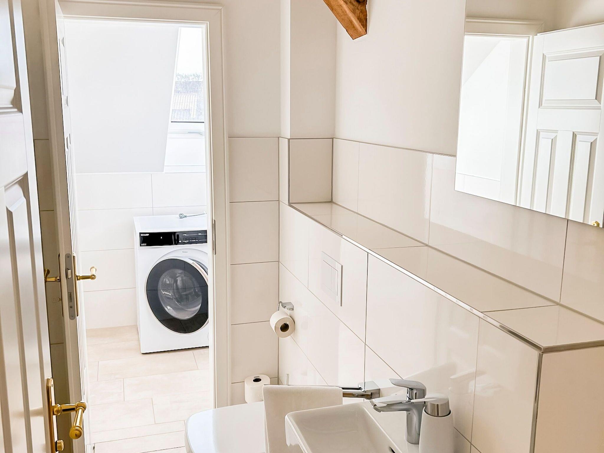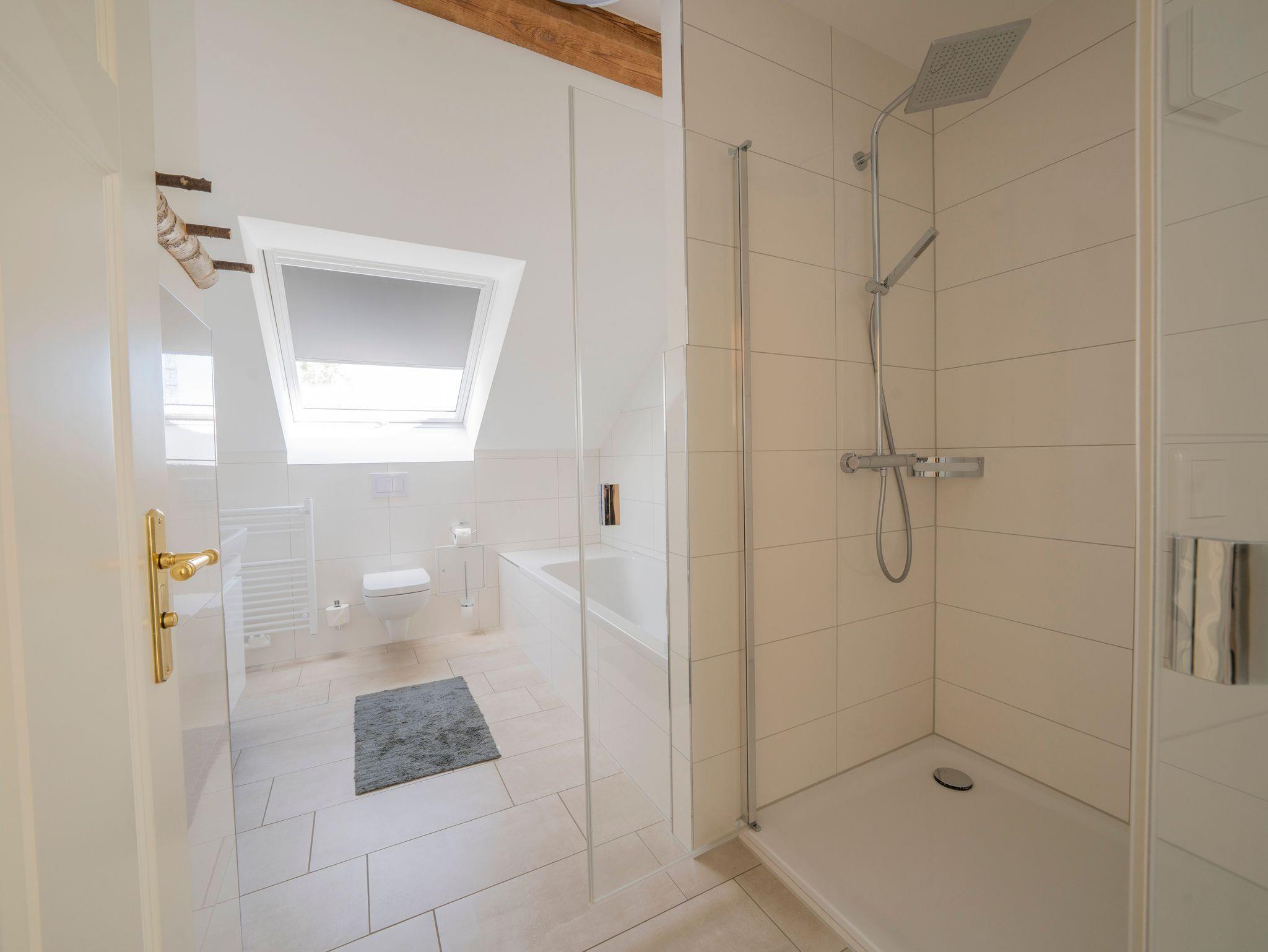 • Badezimmer mit Dusche, Badewanne + Gäste-WC