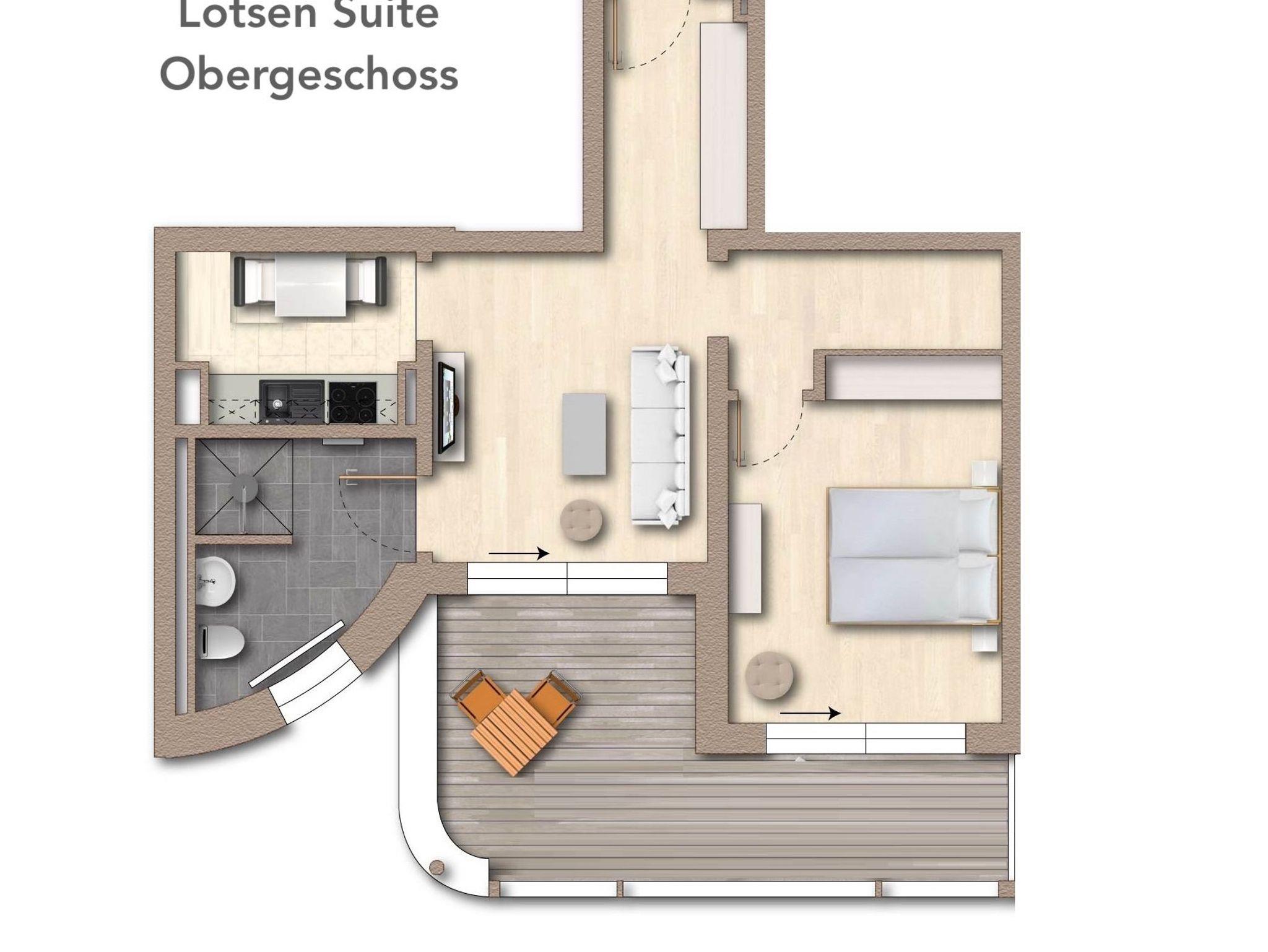 Die Lotsen Suite bietet reichlich Platz, lassen Sie ihren Blick in Richtung Wasser schweifen und Sie werden vom romantischen Anblick der untergehenden Sonne verzaubert.