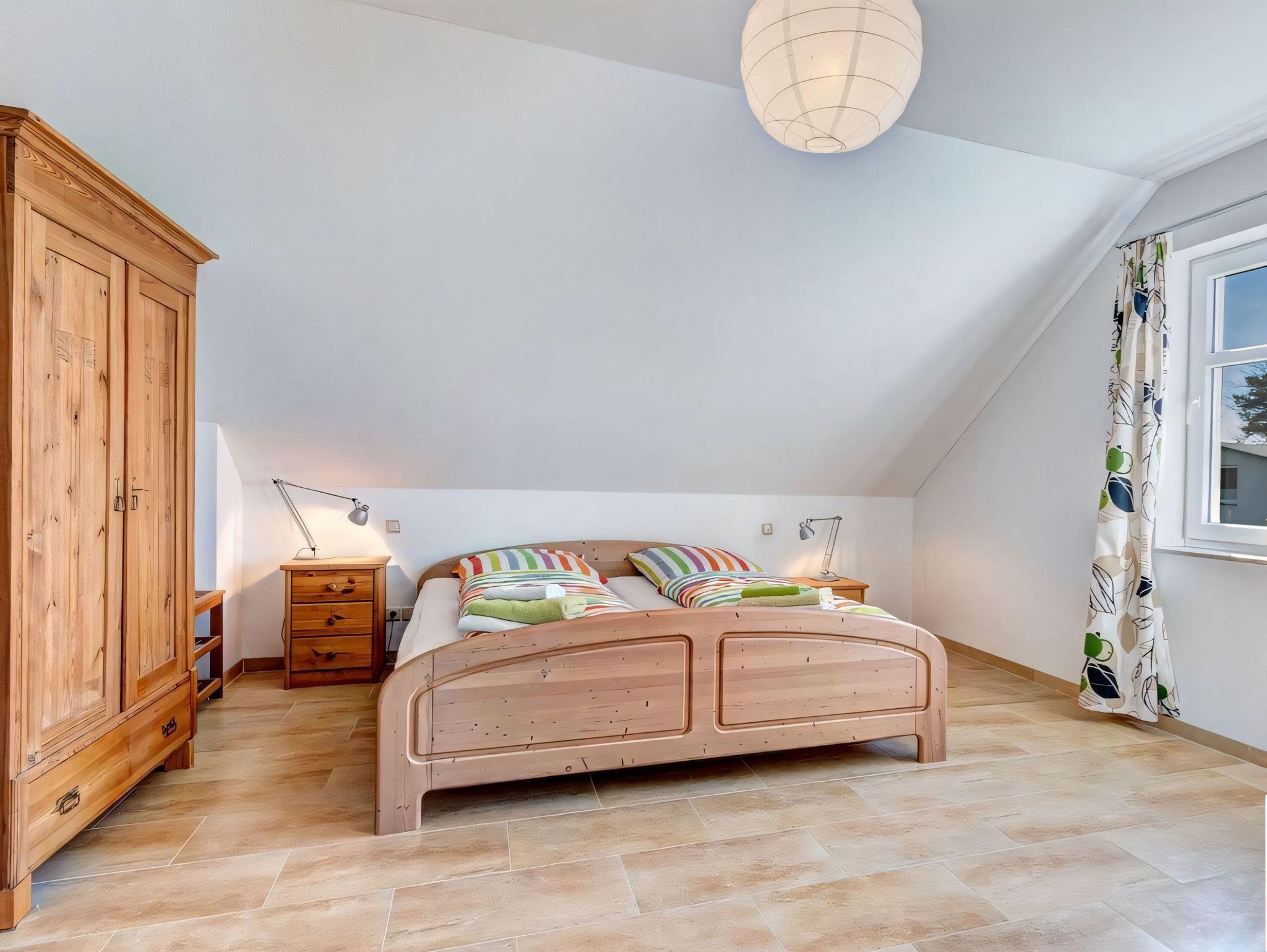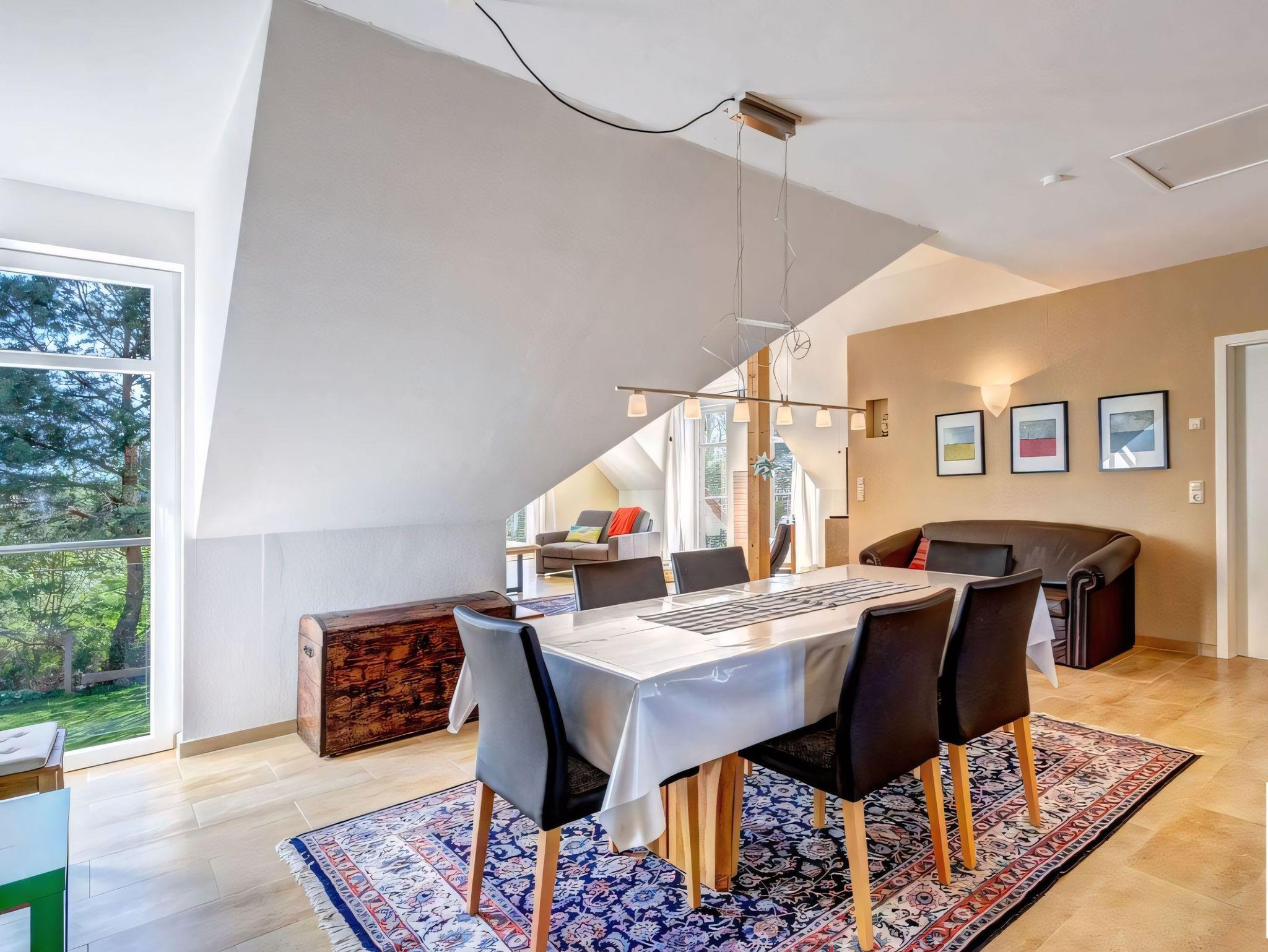 Die Ferienwohnung im Obergeschoss ist über eine separate Außentreppe erreichbar und erstreckt sich über das gesamte Stockwerk. Sie bietet einen großzügigen Wohn- und Essbereich mit bequemen Lederpolstermöbeln, einem Flachbild-TV, einer Hifi-Anlage, einem DVD-Player, einem Esstisch und einer kleinen Urlaubsbibliothek für entspannte Stunden.