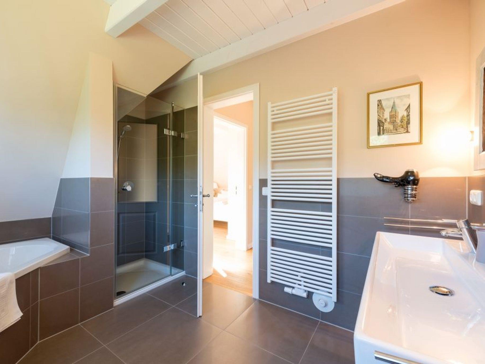 • Helles Wohlfühlbad mit Eckbadewanne, Dusche, WC und Doppelwaschtisch stilvoll gestaltet und bestens ausgestattet.