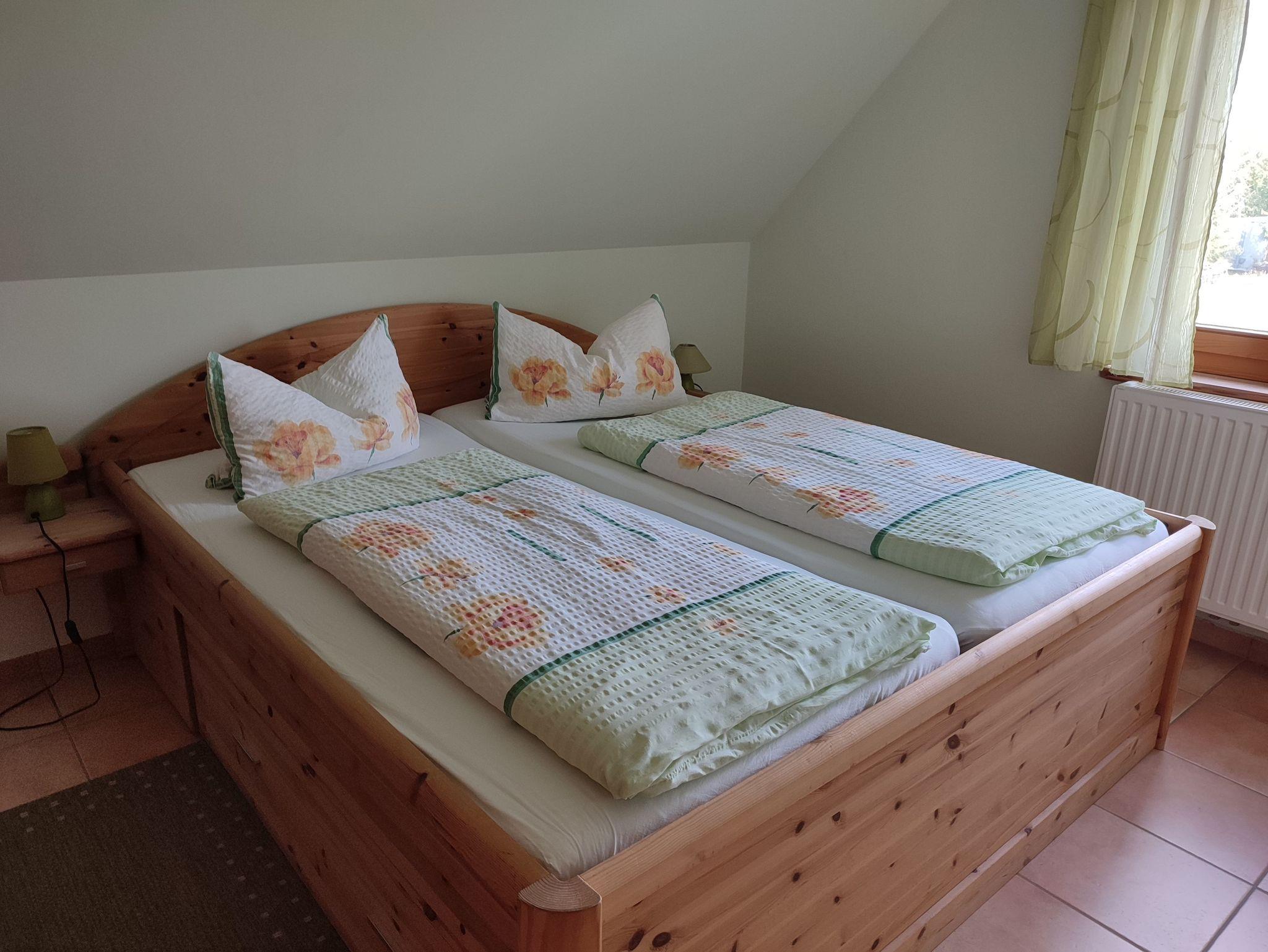 Diese 3 Raum Ferienwohnung im 1.OG verteilt sich auf 2 Etagen. Wohnzimmer mit integrierter Küchenzeile und TV. Schlafzimmer mit Doppelbett, ein Schlafzimmer mit 2 Einzelliegen ist über eine Treppe im ausgebauten Dachgeschoß zu erreichen. Eine Sitzgelegenheit im Garten mit Grillmöglichkeit ist vorhanden. PKW Stellplatz auf dem Grundstück. Handtücher bitte selbster mitbringen. Alle Nebenkosten sind im Preis inklusive!