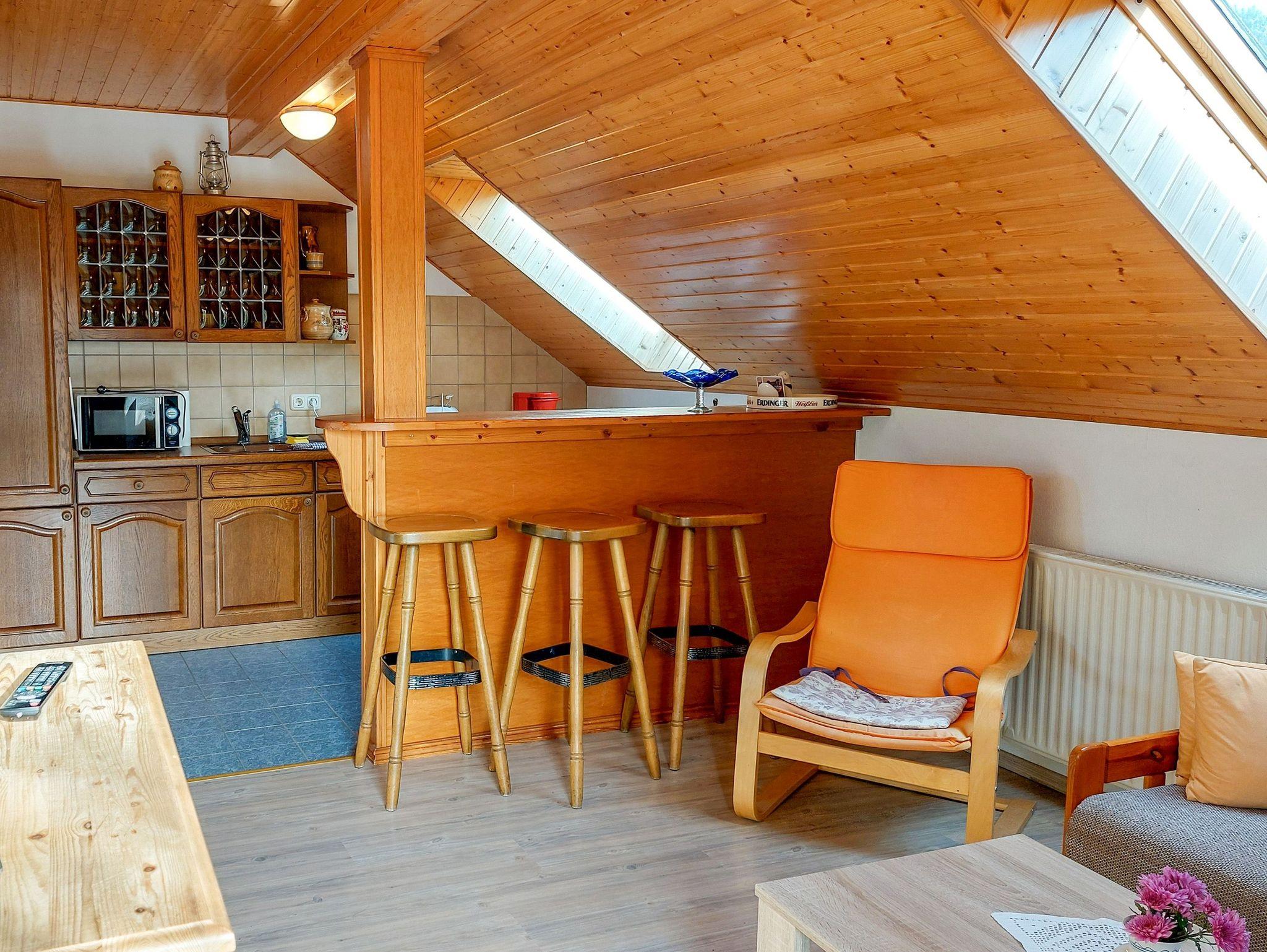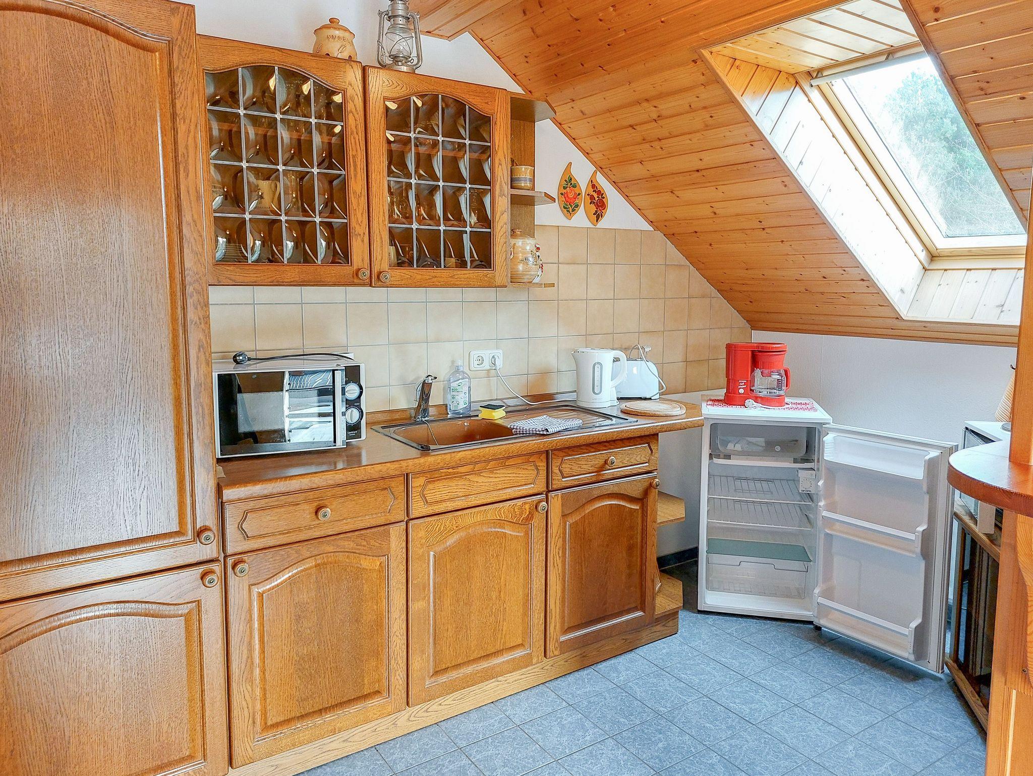 Die 49 m² große Ferienwohnung im Dachgeschoss erreichst du über einen kleinen Balkon. Drinnen erwartet dich ein wohnlich eingerichteter Raum mit integrierter Küche, ein separates Schlafzimmer sowie ein helles Bad mit Fenster. Der Wohnbereich bietet dir eine ausklappbare Couch (150x190), einen bequemen Sessel und einen Fernseher, perfekt zum Entspannen nach einem Ausflug durch den Lieper Winkel. Die kleine Küche ist mit Mikrowelle, einem Kompaktherd mit Grillfunktion, 2 Kochplatten, Kühlschrank, Toaster, Wasserkocher und Kaffeemaschine ausgestattet und eignet sich ideal für die Selbstverpflegung.