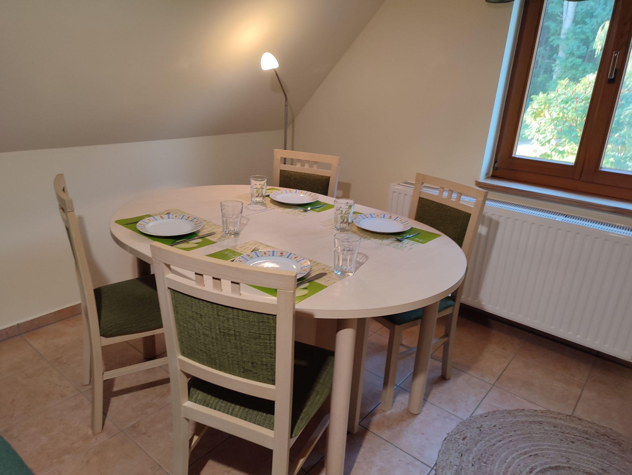 Diese 3 Raum Ferienwohnung im 1.OG verteilt sich auf 2 Etagen. Wohnzimmer mit integrierter Küchenzeile und TV. Schlafzimmer mit Doppelbett, ein Schlafzimmer mit 2 Einzelliegen ist über eine Treppe im ausgebauten Dachgeschoß zu erreichen. Eine Sitzgelegenheit im Garten mit Grillmöglichkeit ist vorhanden. PKW Stellplatz auf dem Grundstück. Handtücher bitte selbst mitbringen. Alle Nebenkosten sind im Preis inklusive!