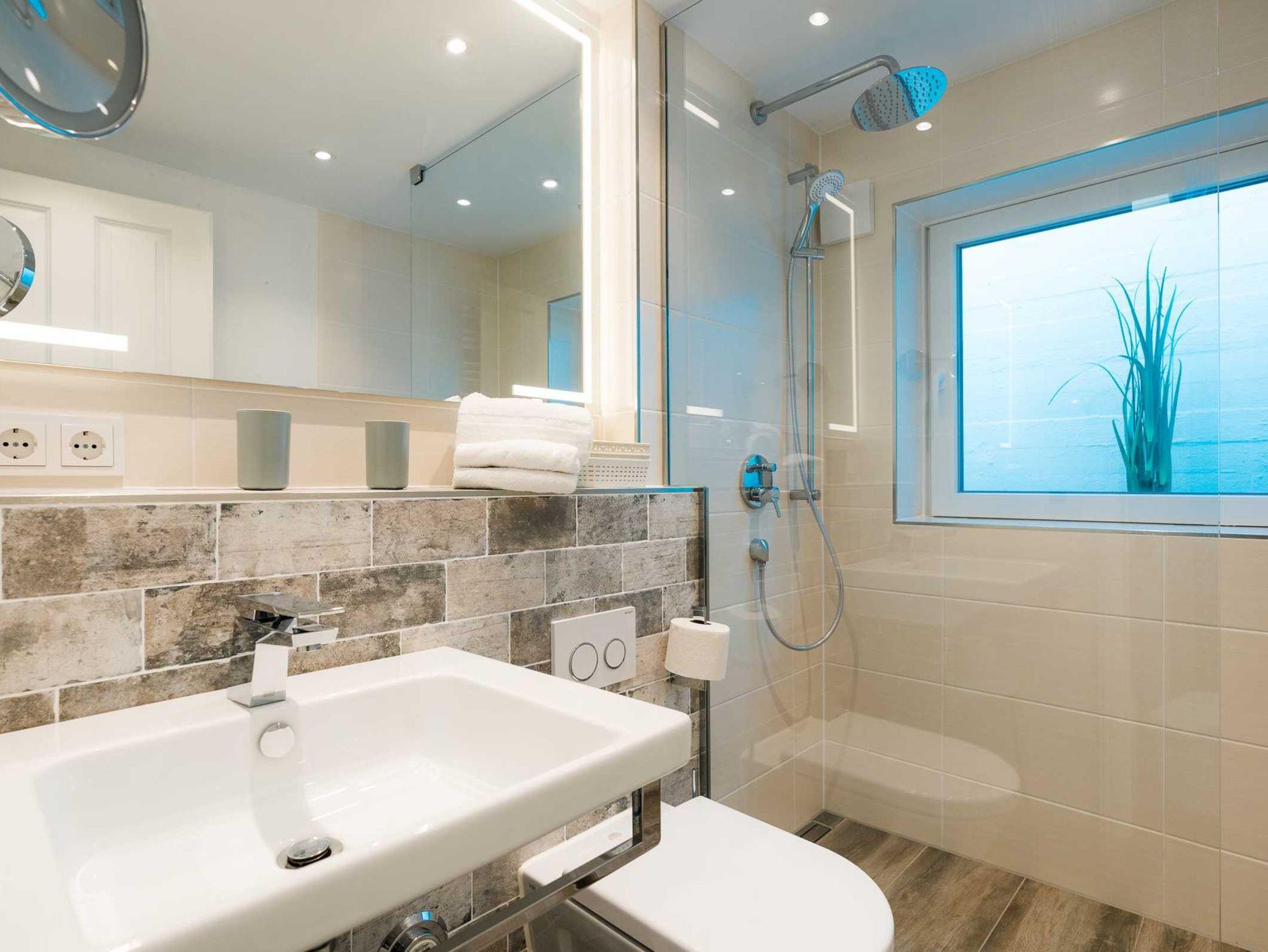 Im Erdgeschoss befindet sich der großzügige Wohn-/ Essbereich, ausgestattet mit einer komfortablen Doppelschlafcouch, einem Ledersessel, Smart-TV und einem Esstisch für 4 Personen. Die separate Küche ist ausgestattet mit einem Backofen mit Mikrowellenfunktion, Ceran-Kochfeld, einer Kaffeemaschine sowie eine Nespresso Kapselmaschine. Das Schlafzimmer verfügt über ein sehr bequemes Boxspringbett (180 cm breit) und eine große Fensterfront und befindet sich im Untergeschoss der Wohnung .Das Schlafzimmer ist noch mit einem zusätzlichen Smart-TV ausgestattet. Das Bad, ebenfalls im UG des Hauses, verfügt ebenfalls über ein Fenster und ist mit einer ebenerdigen Regendusche, sowie einem Kosmetikspiegel, einem fest integriertem Radio und Fußbodenheizung, ausgestattet.