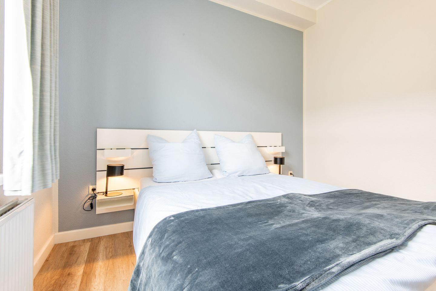 - Das Schlafzimmer bietet ein Doppelbett (160 x 200 cm).