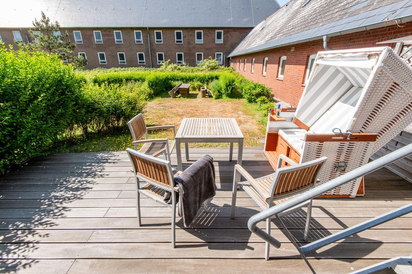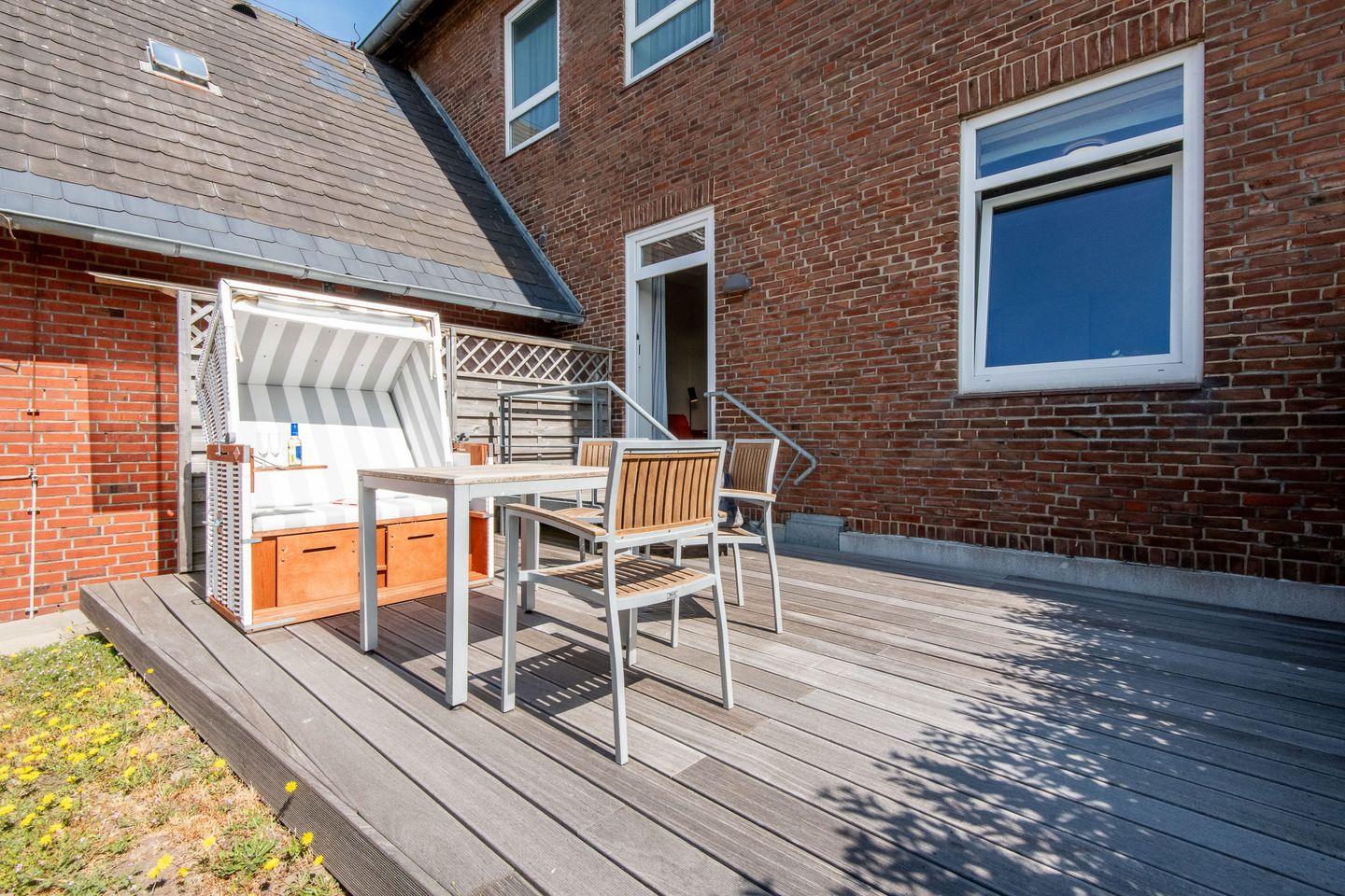 - Die gemütliche Holzterrasse mit Tisch und Stühlen sowie Zugang zur Rasenfläche macht den Aufenthalt im Freien komfortabel.
