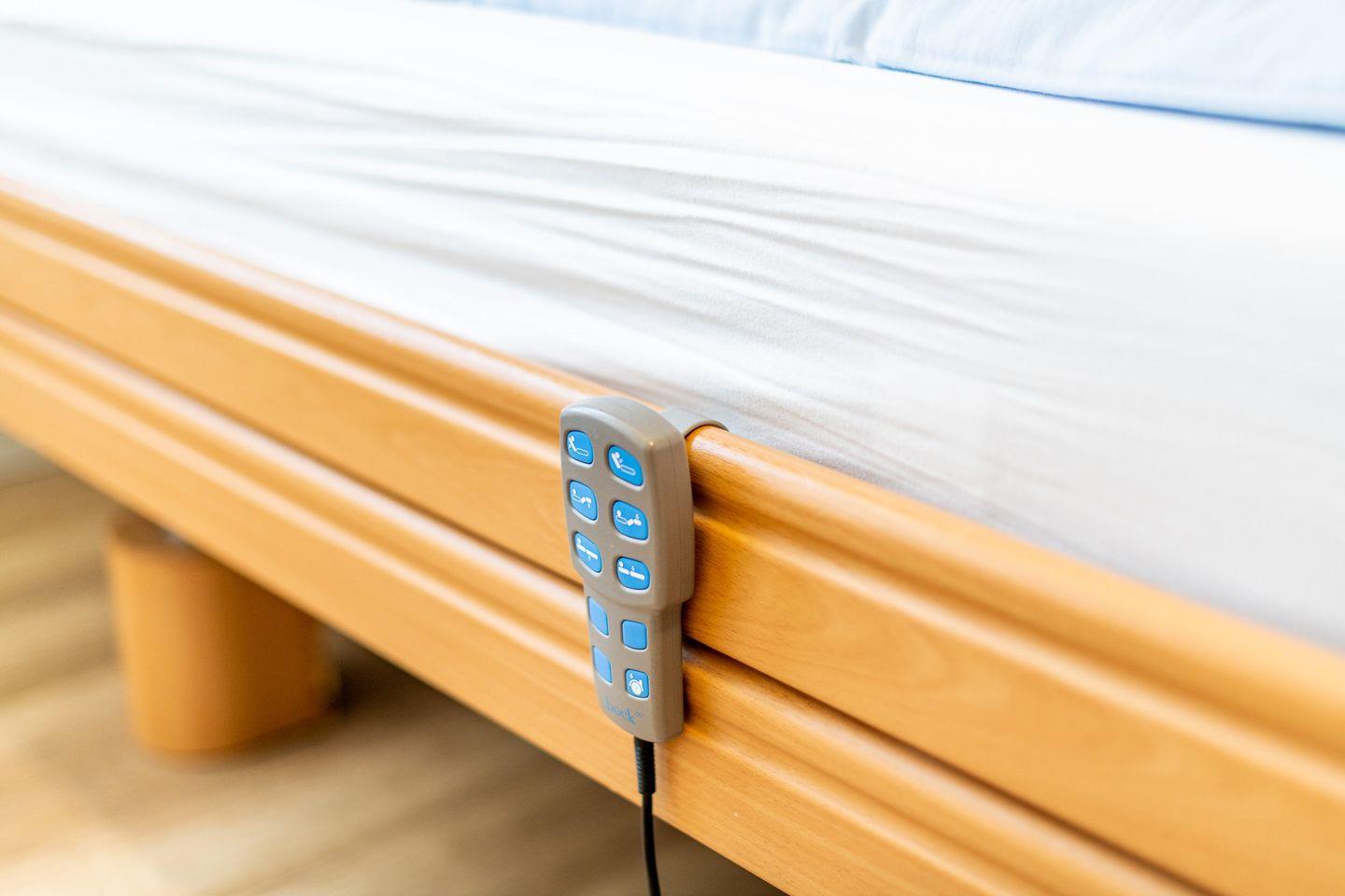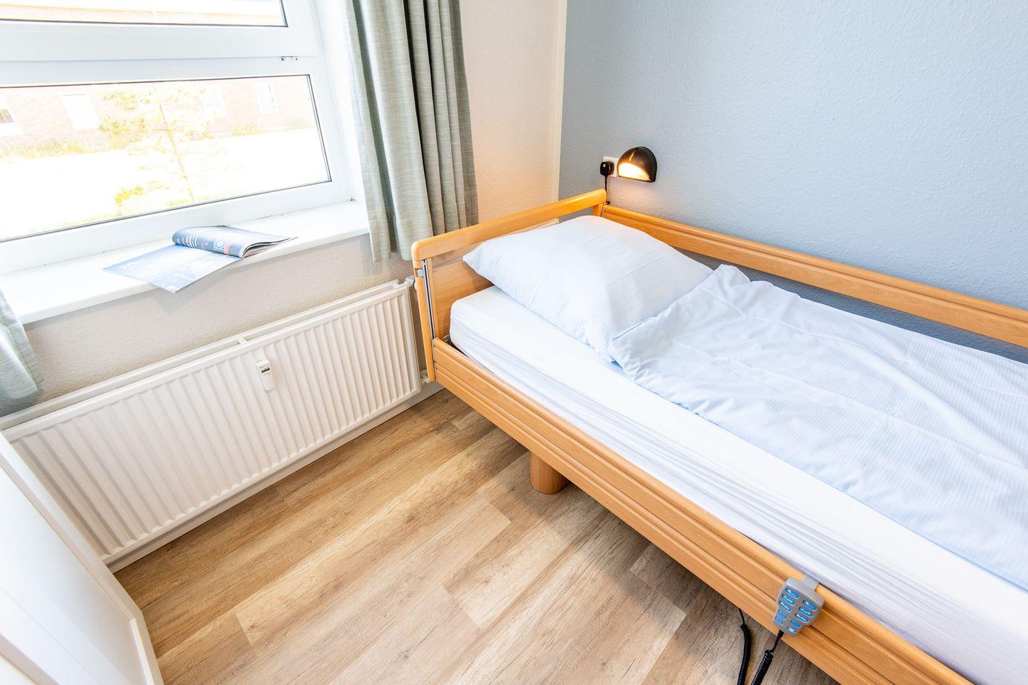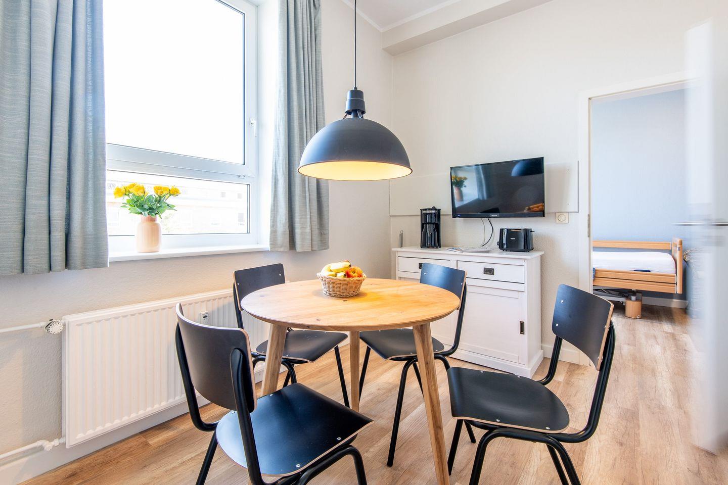 Die Essecke gliedert sich direkt an die Küchenzeile an. Von hier aus gelangt man in den geteilten Wohn-Schlafbereich und ins separate Schlafzimmer mit einem Einzel- und einem Pflegebett.