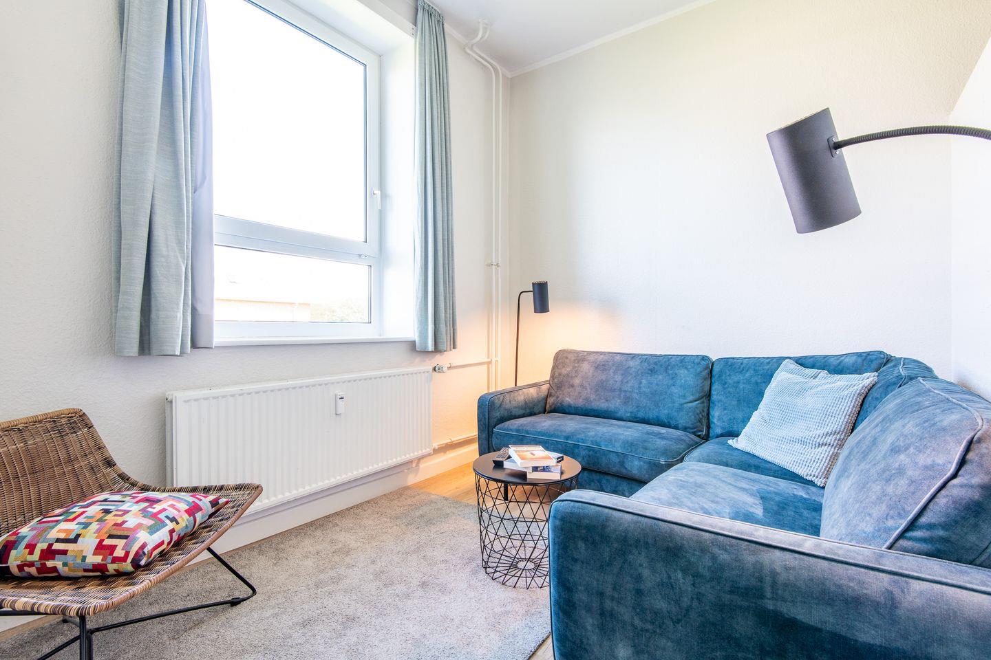 Der Wohn-Schlafbereich ist mit einer gemütlichen Sofaecke sowie einem TV-Gerät ausgestattet. Der Schlafbereich ist durch eine Wand (ohne Tür) vom Wohnbereich getrennt und mit einem bequemen Doppelbett und einem Kleiderschrank möbliert.