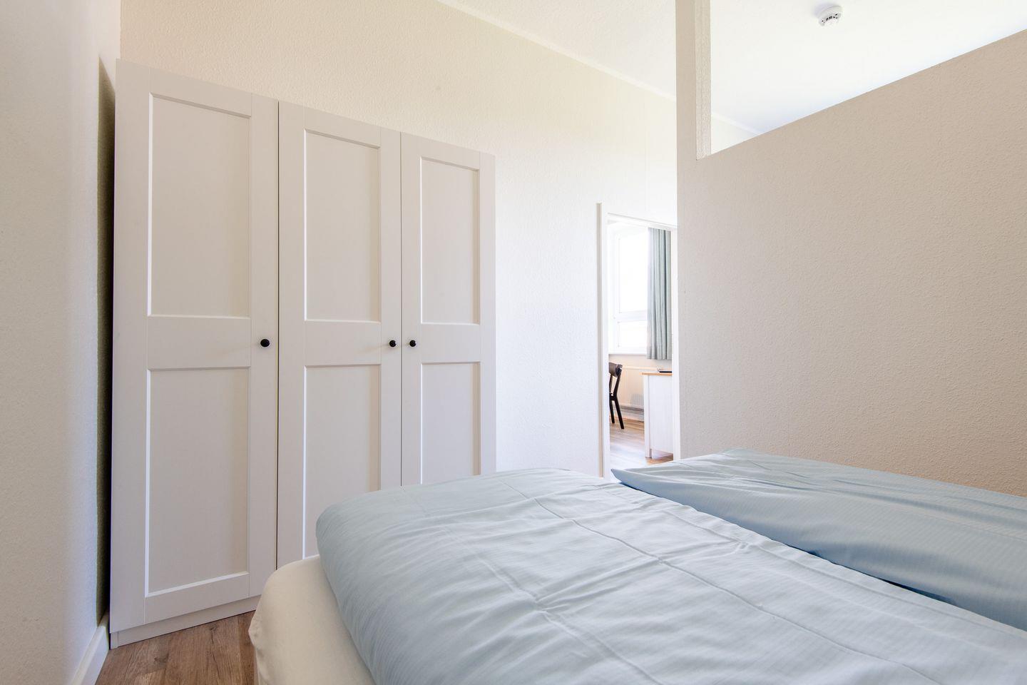 Der Wohn-Schlafbereich ist mit einer gemütlichen Sofaecke sowie einem TV-Gerät ausgestattet. Der Schlafbereich ist durch eine Wand vom Wohnbereich getrennt und mit einem bequemen Doppelbett und einem Kleiderschrank möbliert.