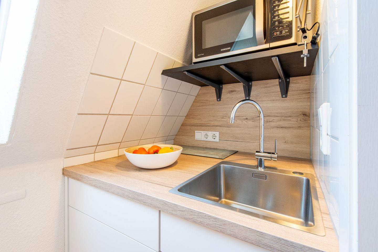 Im Eingangsbereich ist viel Stauraum mit Einbauschränken. Von hier aus kommen Sie in den Essbereich mit einem Tisch und zwei Stühlen. Direkt an den Essbereich schließt sich die kleine Küche an. Sie ist mit einem kleinen Ceran-Kochfeld, Kühlschrank und Mikrowelle ausgestattet. Kochutensilien und Geschirr gehören zum Inventar.