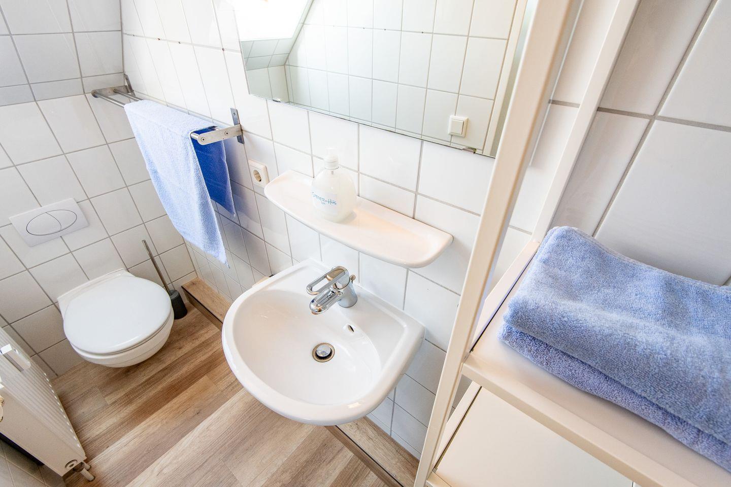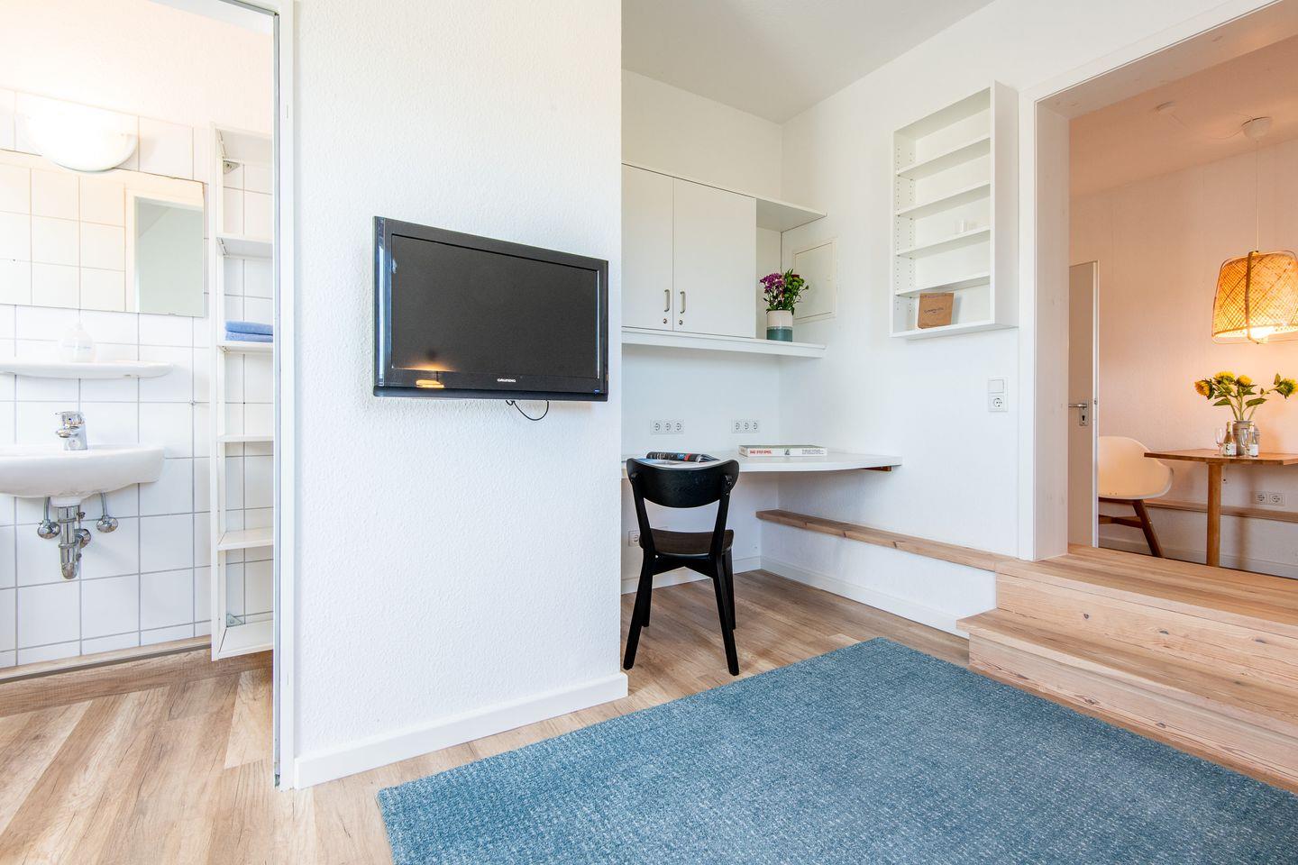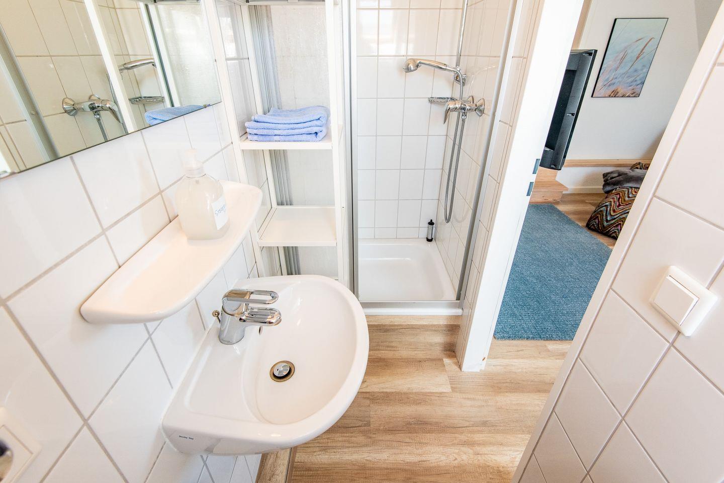 Von hier aus schließt sich das Badezimmer mit einer Dusche an.