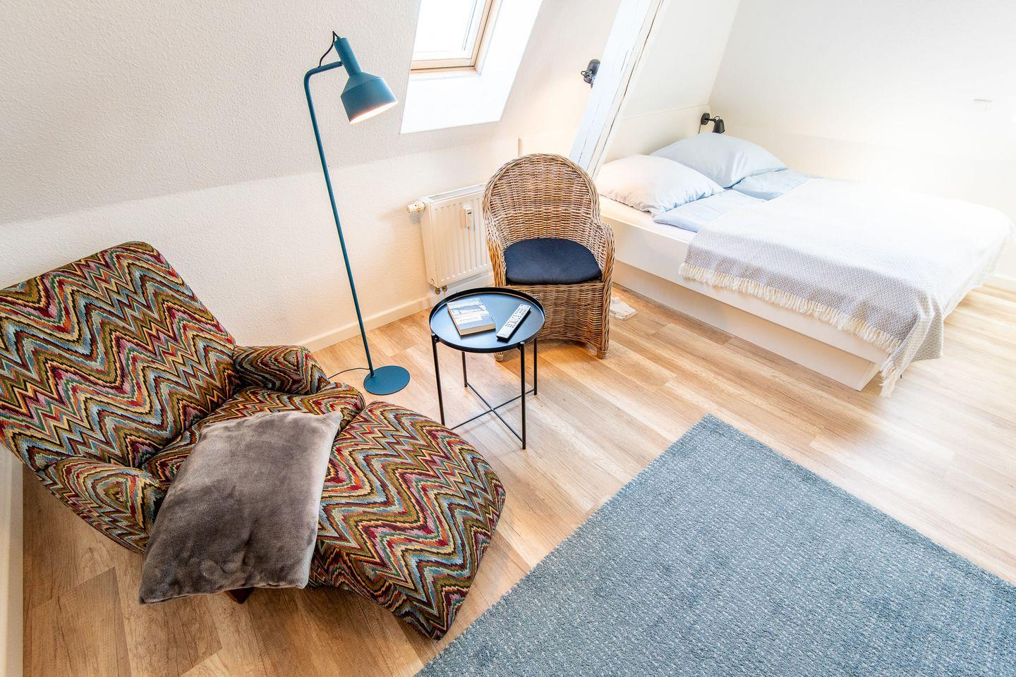 Über zwei Stufen gelangen sie in den Wohn- und Schlafraum in dem ein Doppelbett (160x200cm) steht. Zwei gemütliche Sessel laden zum verweilen ein.