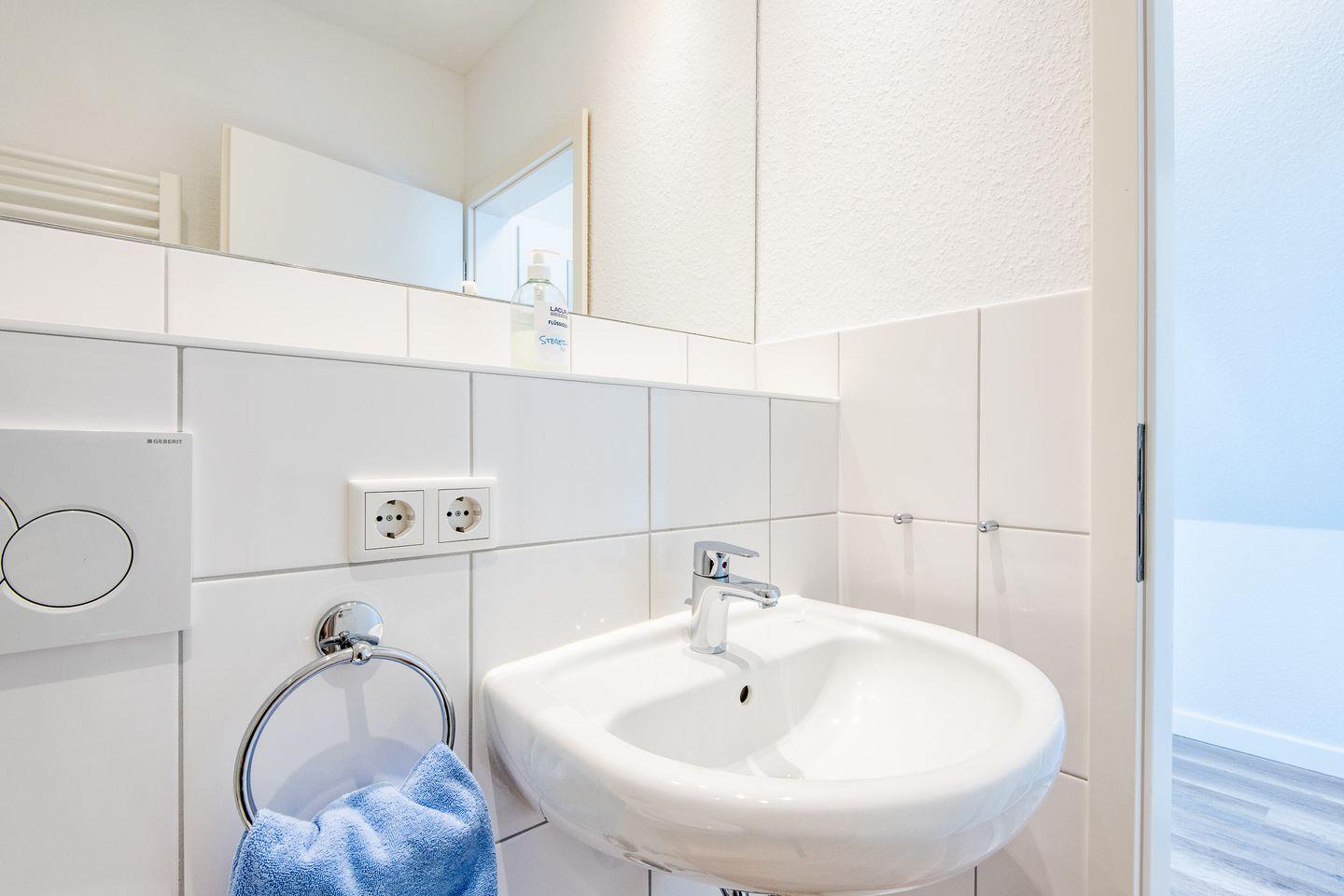 Die Wohnung verfügt über ein Badezimmer, welches mit einer bodengleichen Dusche, einem WC, einem Waschbecken und einer Handtuchheizung ausgestattet ist.