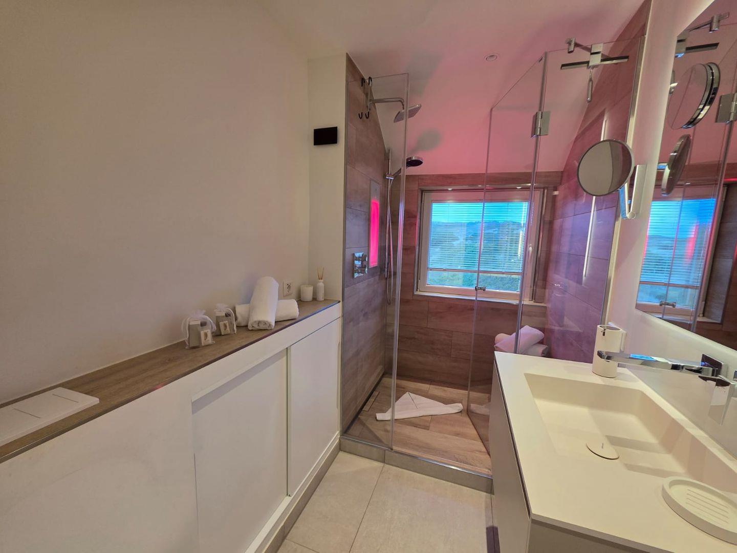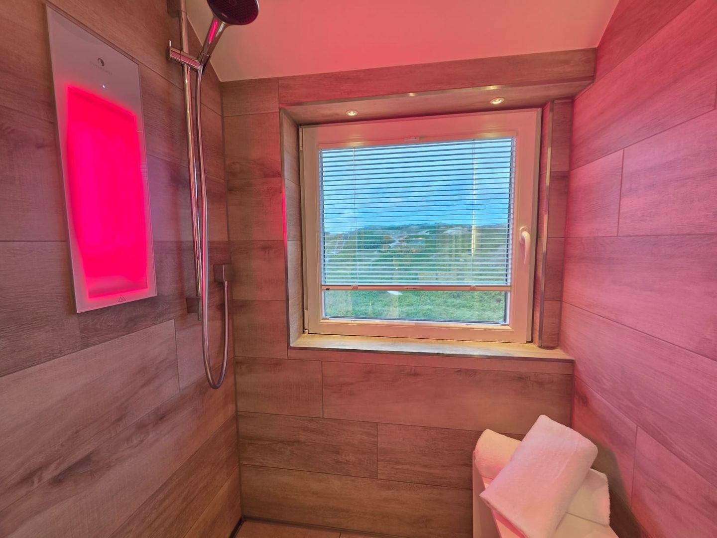 Das Hauptschlafzimmer befindet sich auf der gleichen Ebene und ist mit einem komfortablen Boxspringbett in der Größe 1,80 x 2,00 Meter ausgestattet. Ein geräumiger Kleiderschrank bietet ausreichend Stauraum für Ihre Garderobe. Das helle Duschbad ist modern gestaltet und verfügt über eine Regendusche sowie eine Sunshower mit Infrarotfunktion, die ein wohltuendes Sauna-Feeling vermittelt.
