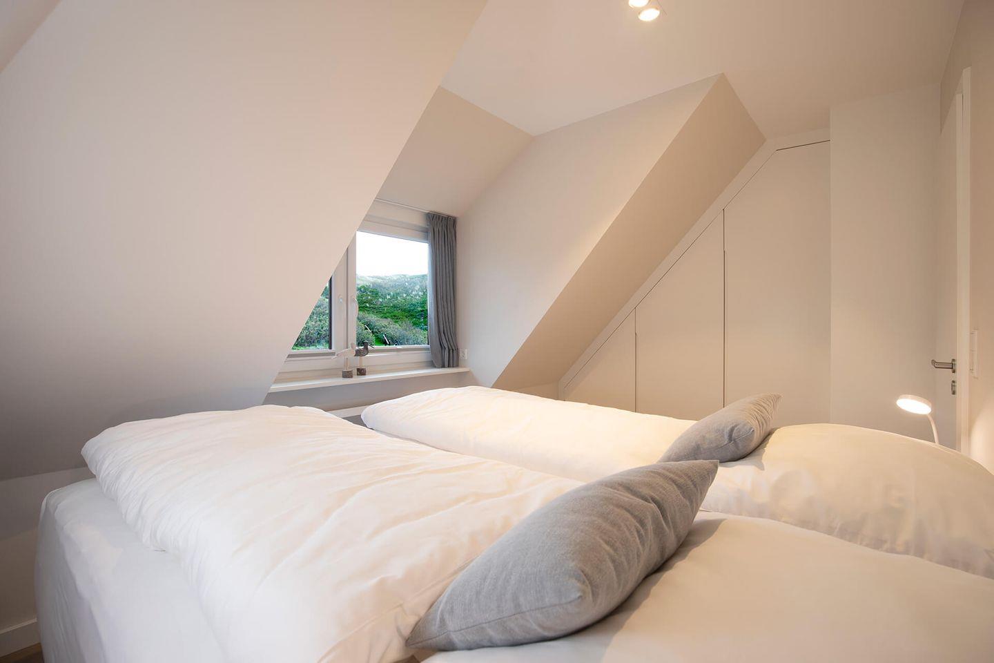 Über eine Treppe im Flur gelangen Sie in das Dachgeschoss, in dem zwei Einzelbetten in der Größe 0,90 x 1,90 Meter auf Sie warten. Ein eingebauter Kleiderschrank sorgt auch hier für Ordnung und Stauraum.