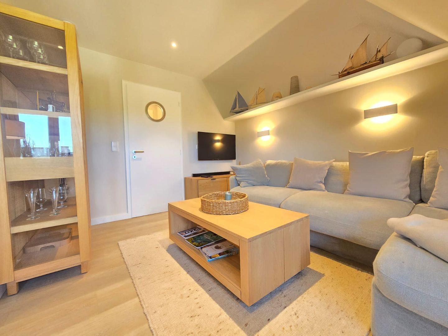 Der offene Wohn- und Essbereich ist geschmackvoll eingerichtet und verbindet Funktionalität mit gemütlicher Atmosphäre. Ein großes Sofa, das bei Bedarf als Schlafcouch genutzt werden kann, lädt zum Relaxen ein. Ein TV mit Telekom Magenta und Android-Plattform inklusive Netflix sowie ein DAB-Radio mit Anschluss für Spotify oder Amazon Music sorgen für Unterhaltung. Die offene Küche ist hochwertig ausgestattet und verfügt über einen Miele Backofen mit integrierter Mikrowelle, einen großen Liebherr Kühlschrank mit Gefrierfach, einen Miele Induktionsherd und eine Miele Geschirrspülmaschine, sodass auch die Selbstversorgung mühelos möglich ist.
