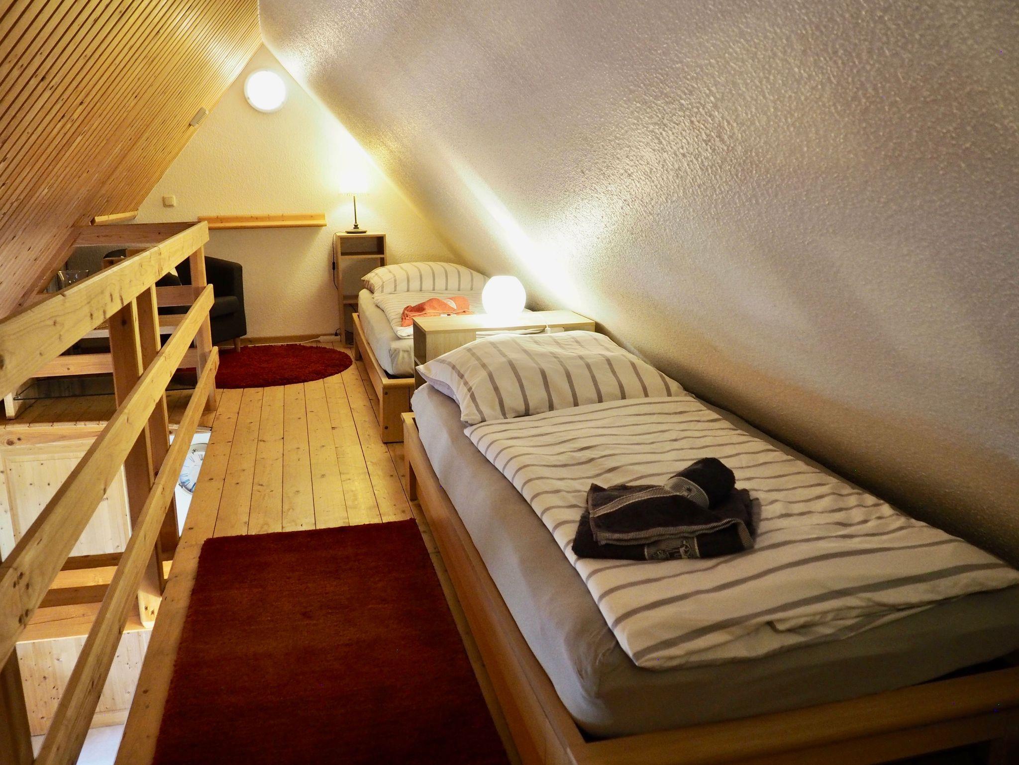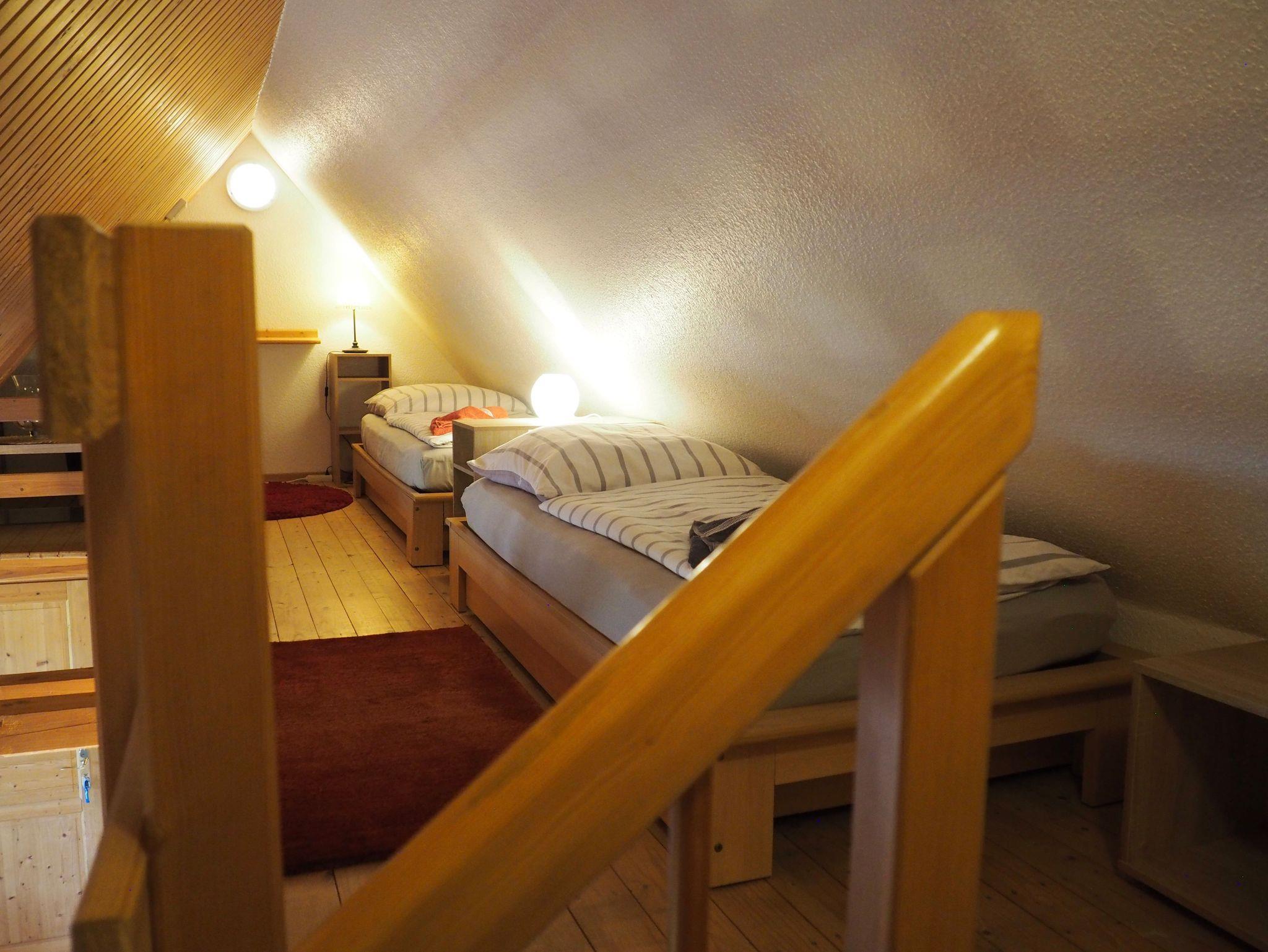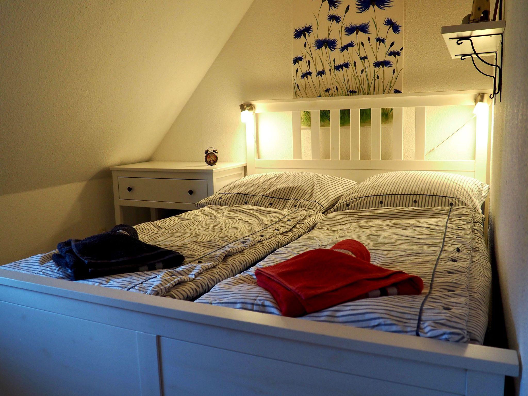Ein behagliches Schlafzimmer mit komfortablem Doppelbett sorgt für erholsame Nächte. In der offenen Galerie im Dachgeschoss befinden sich zwei weitere Einzelbetten ein Lieblingsplatz besonders für Kinder oder junge Gäste.