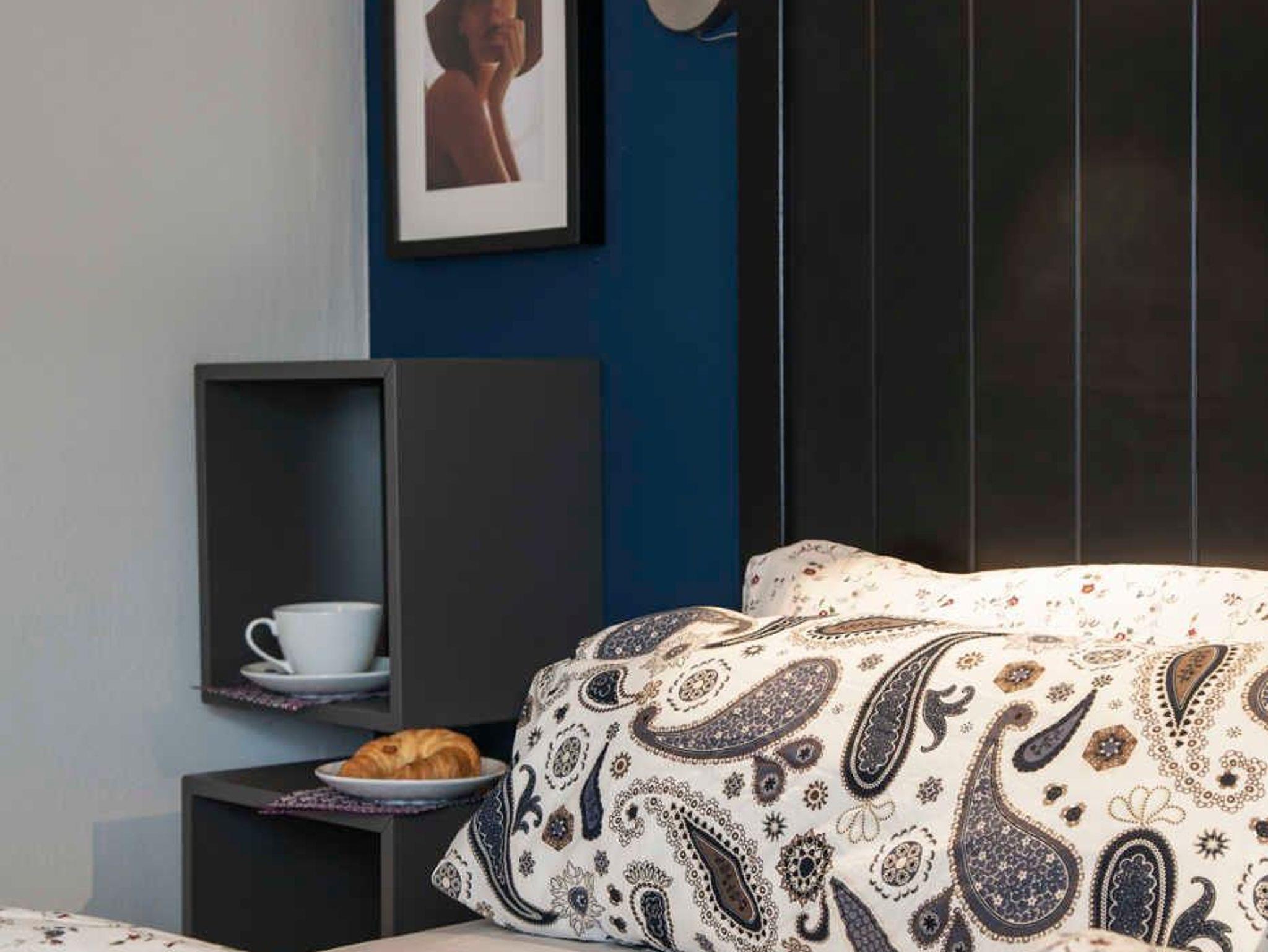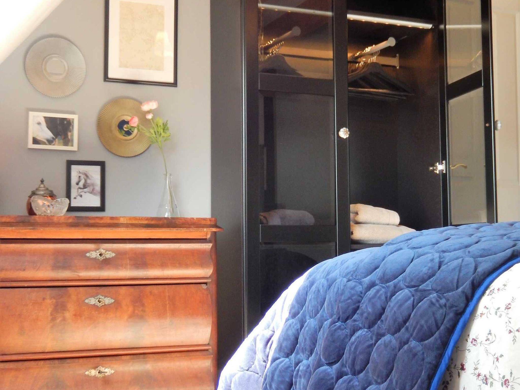 Das 3. Schlafzimmer gleicht einer Puppenstube. Neben dem antiken Bett steht ein Nachtschränkchen mit Leselampe, auf der anderen Seite ein Kleiderschrank und Bücherregal mit Spiegel. Die verspielte Einrichtung verströmt einen besonderen Charme. Das Fenster ist ausgestattet.