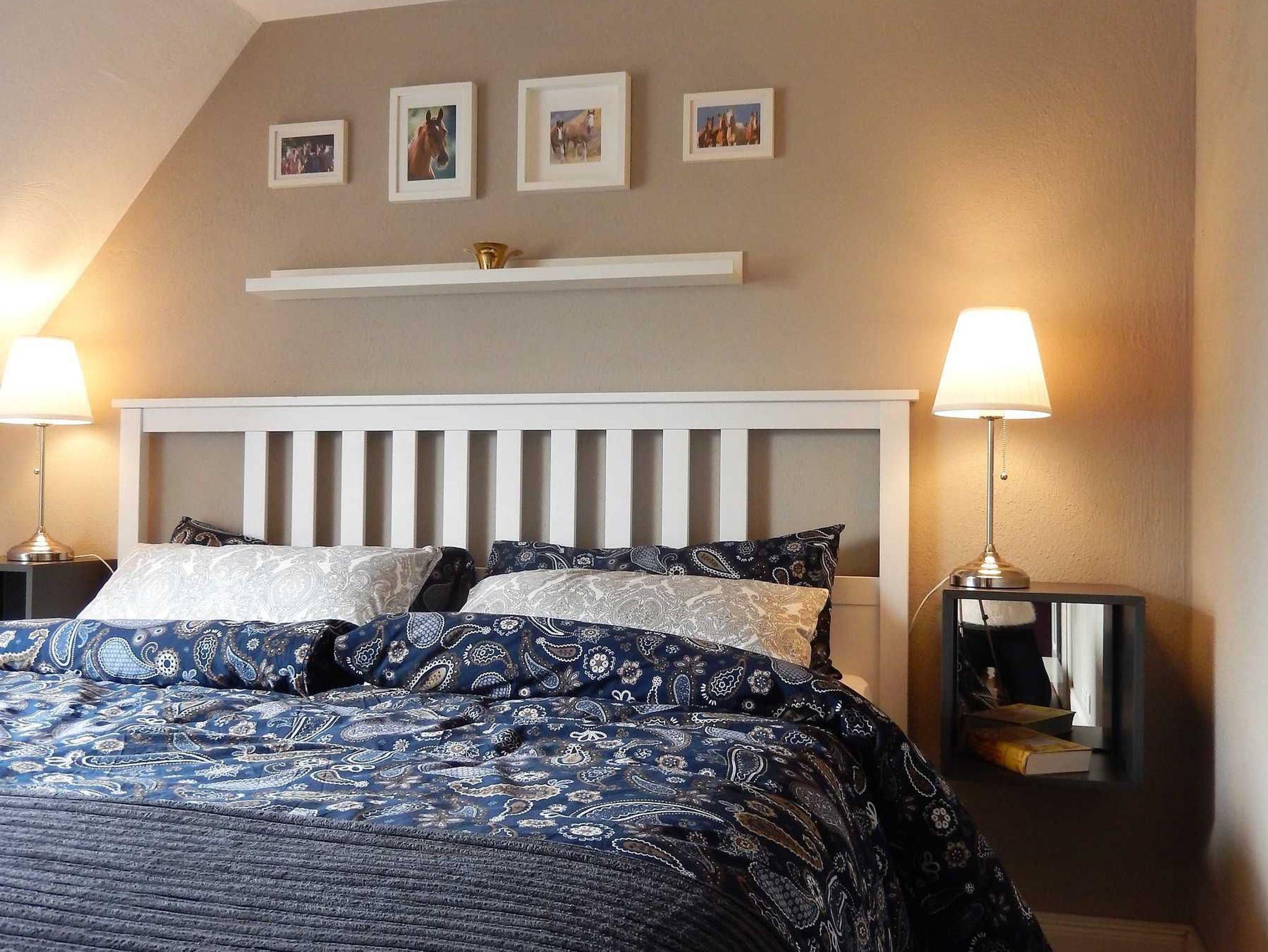 Ein Schlafzimmer ist ausgestattet mit einem Doppelbett (180 x 200) und einer wundervoll dicken Matratze, jede Bettseite hat einen Nachttisch mit einer Leselampe und davor einen Teppich. Neben dem Kleiderschrank mit Innenbeleuchtung steht eine geräumige Kommode mit Schubladen. Eine nostalgische Glasschale und eine zusätzliche Tischlampe mit gedimmten Licht sorgen für Wohlfühlatmosphäre.