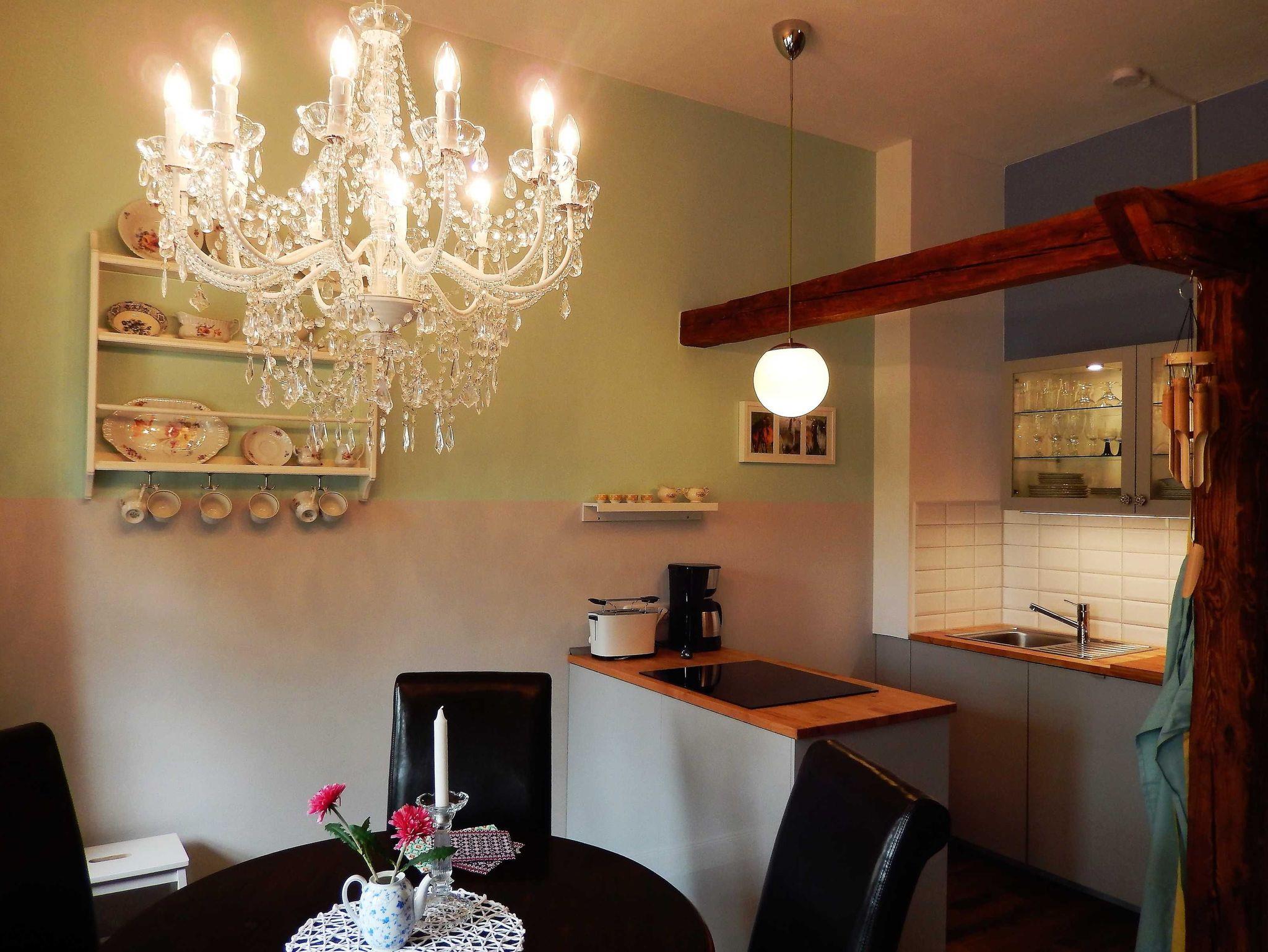 Die Küchenausstattung ist komplett mit Töpfen und Pfannen und allen zum Kochen notwendigen Utensilien wie: Kartoffelstampfer, Dosenöffner, Korkenzieher, Sparschäler, Mixstab, Kochlöffel, Knoblauchpresse, anständige Messer etc. Ein Kaffeevollautomat der Firma Saeco und ein Milchaufschäumer zaubern einen perfekten Cappuccino. Zusätzlich gibt es eine Kaffeemaschine, einen Wasserkocher und Toaster. Geschirr und Besteck sind für 12 Personen damit der Geschirrspüler auch gefüttert werden kann. Außerdem gibt es Espressotassen, Michkaffeetassen, Müslischalen und zum Teil antike Servierschüsseln und Platten.