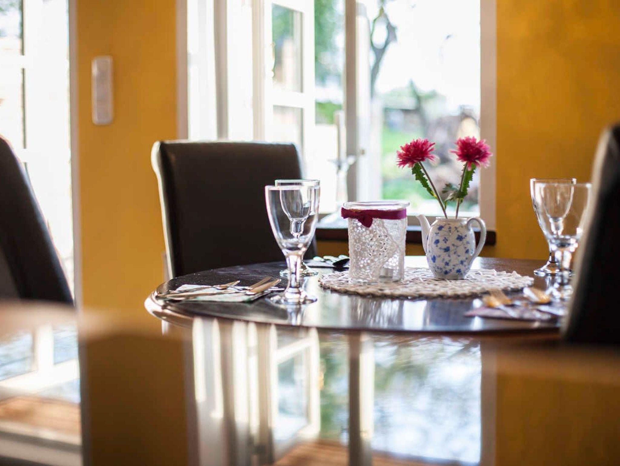 Der Essbereich grenzt an die Kochinsel. Über dem Holztisch mit 5 Polsterstühlen thront ein wunderschöner Kronleuchter mit 12 Leuchten, der stufenlos gedimmt werden kann.