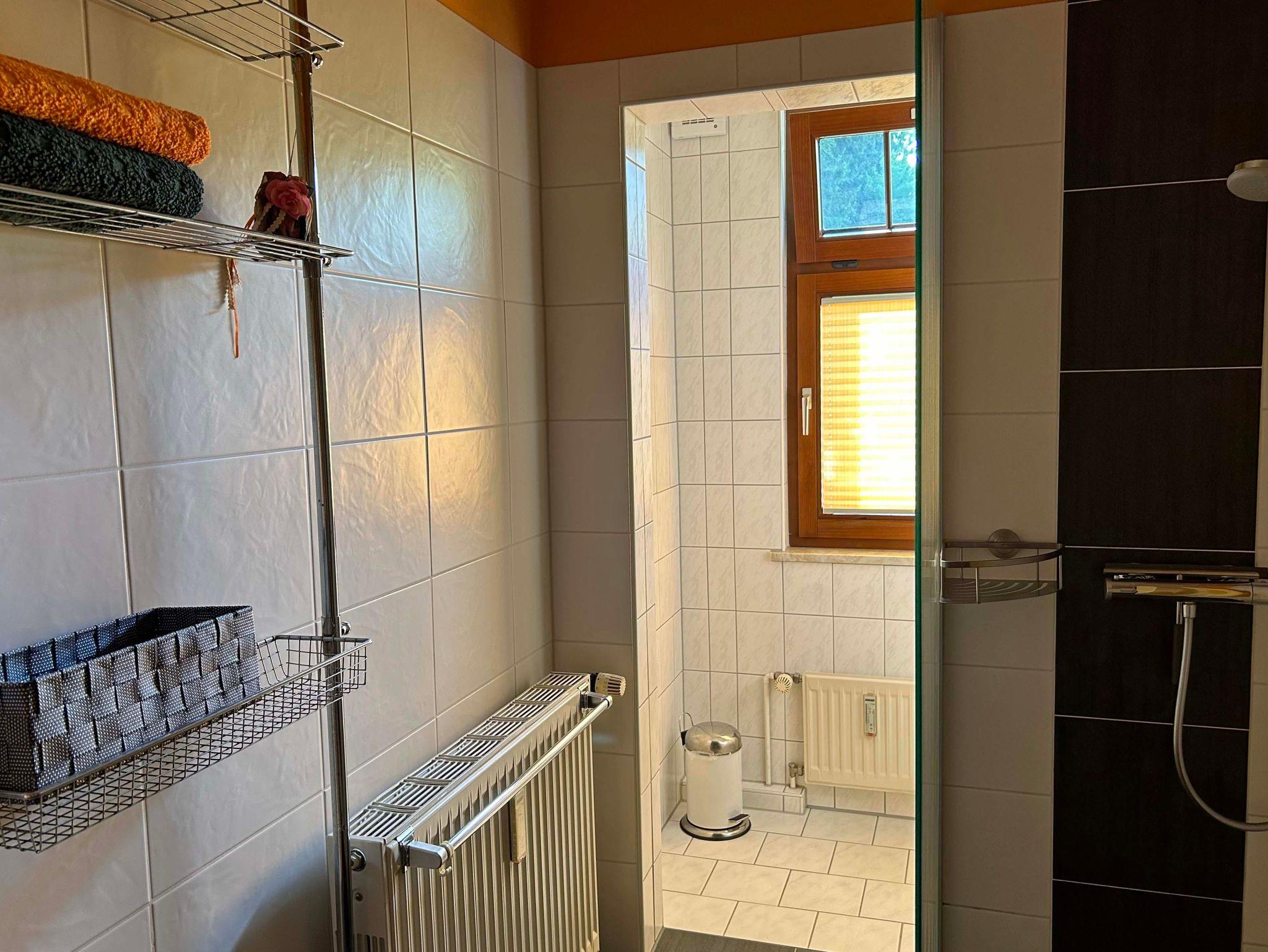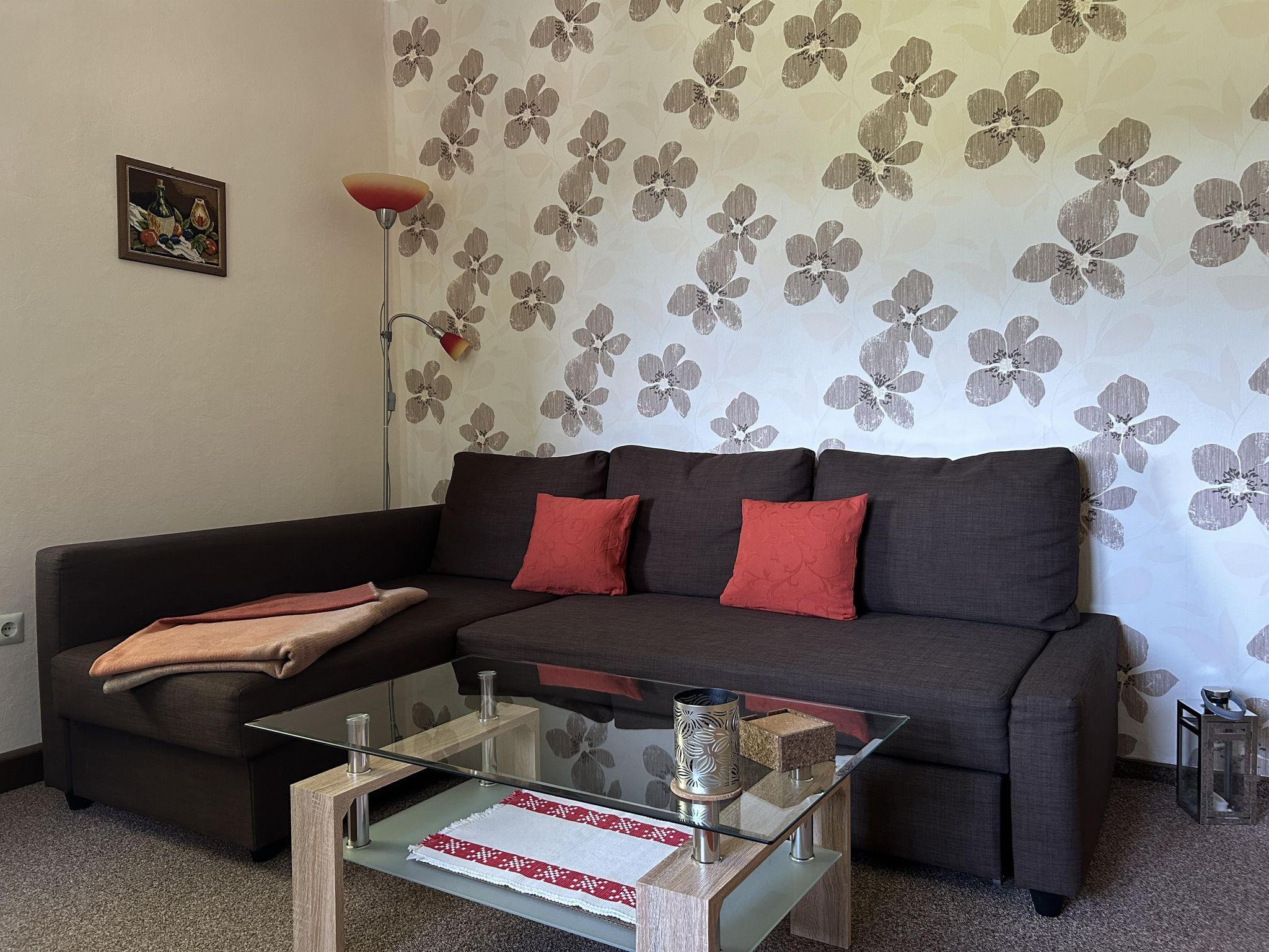 Die Ferienwohnung liegt in der 1. Etage und verfügt über einen separaten Schlafraum mit Doppelbett, einen Wohnraum, Küche sowie ein Bademzimmer mit ebenerdiger Dusche und WC. Der Wohnraum ist mit einer gemütlichen Couch, auf der zwei weitere Schlafmöglichkeiten bestehen und TV eingerichtet. Die separate Küche ist mit einer Essecke für 4 Personen und einer Küchenzeile mit Cerankochfeld, Kühlschrank, Kaffeemaschine, Wasserkocher und Mikrowelle ausgestattet.