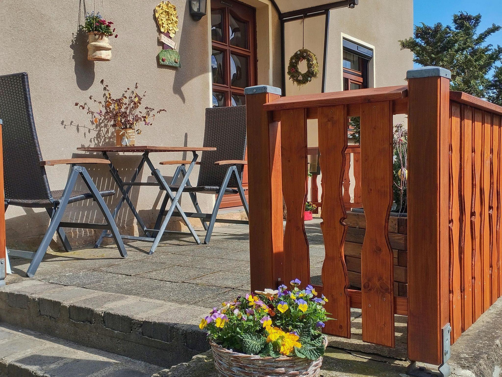 Der Balkon mit Gartenmöbel bietet einen wunderbaren Ausblick auf die Elbe und den Lilienstein.