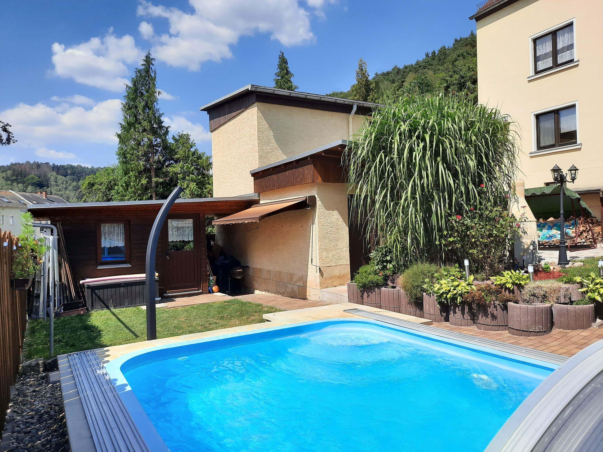 Im Garten befindet sich eine Sitzecke mit Grillmöglichkeit sowie ein Pool für alles Gäste des Hauses.