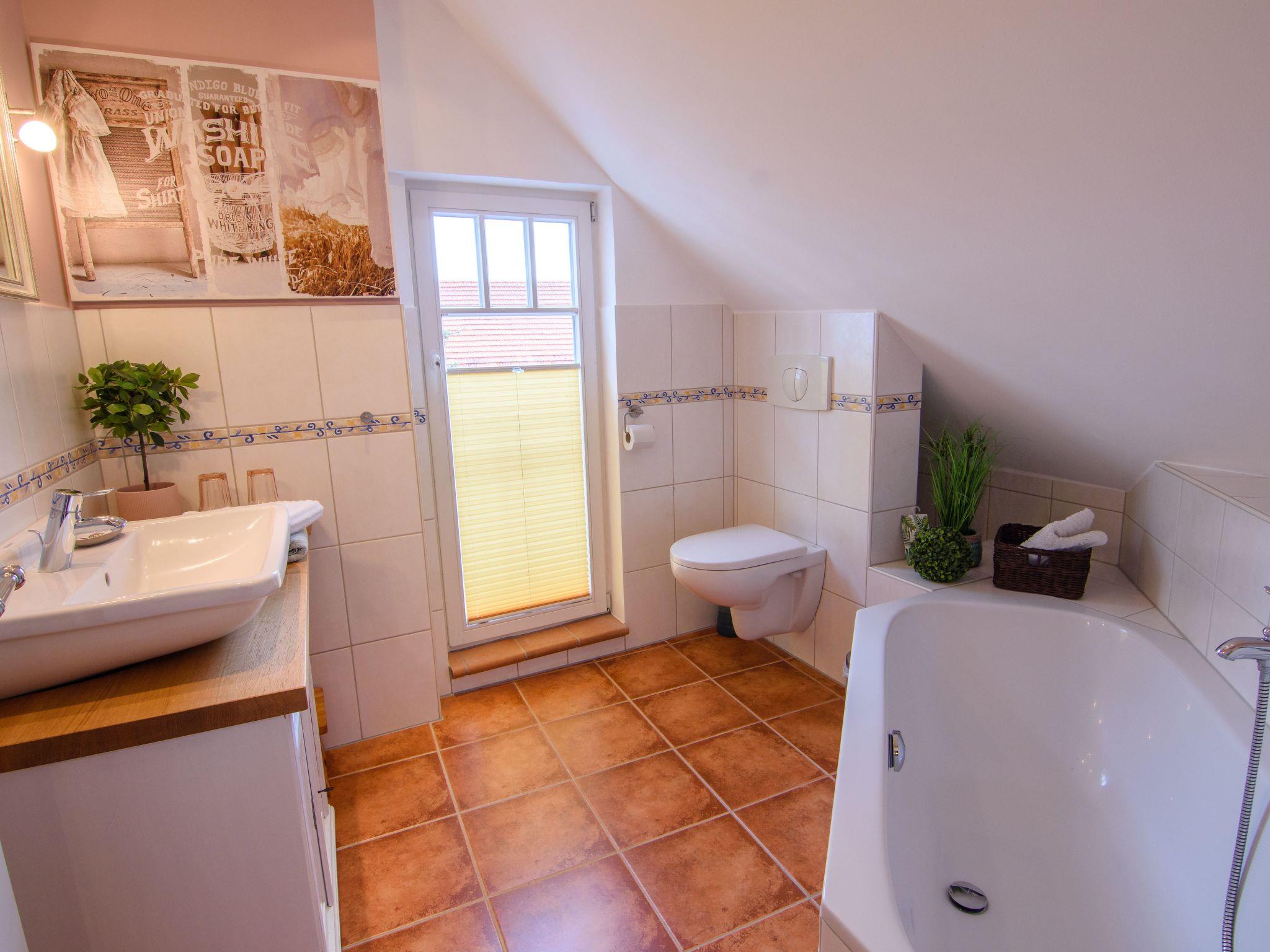 Our holiday flat 2 is located in a converted part of the outbuildings from the 19th century. The former hayloft has been lovingly converted into a cosy flat in a stylish country house style. The covered balcony is directly accessible from the living room and the adjoining dining room. It has two separate bedrooms, a shower room with a spacious walk-in shower, a second bathroom with a bathtub and a fully equipped country-style kitchen. In addition to the balcony, you are welcome to use the seating areas in the courtyard and garden.