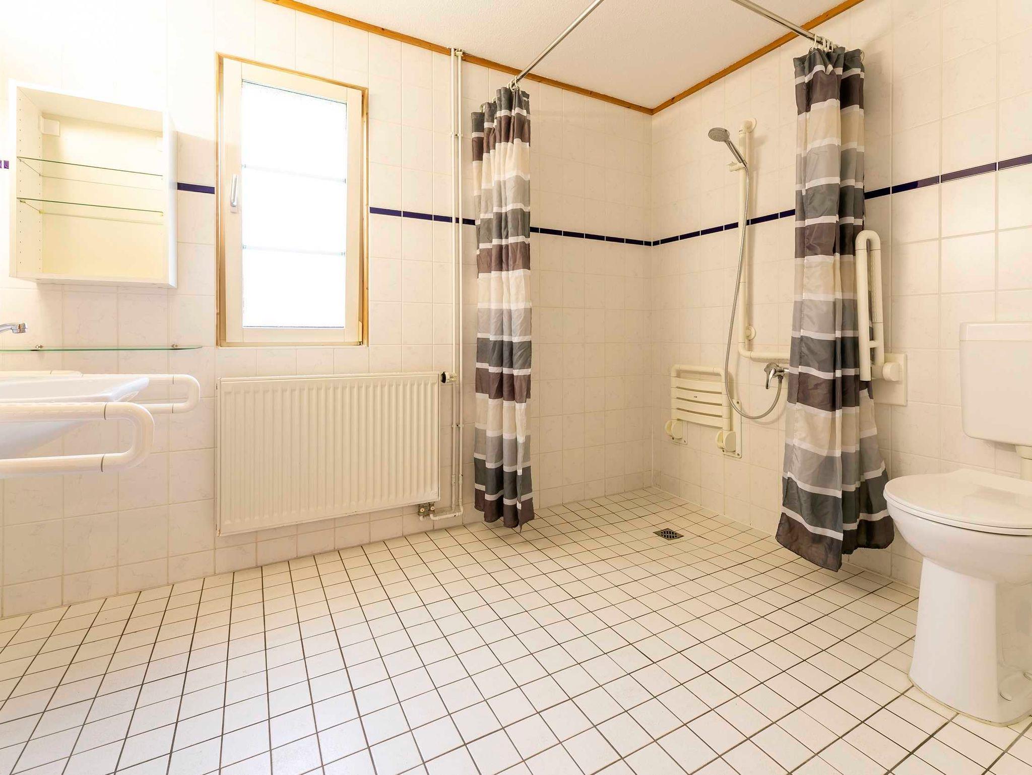 In 2 Schlafzimmern, eines davon ist mit einem Doppelbett und das andere Schlafzimmer ist mit 2 Einzelbetten ausgestattet, finden 4 Personen Platz. Mit einer Größe von 89 qm ist die barrierefreie Ferienwohnung sehr großzügig und bietet Gästen mit Rollstuhl genügend Platz. Die Möbel sind verschiebbar. Die Türbreite beträgt 92 cm. Ebenerdige Zugänge zum Bad und zu den Zimmern erleichtern die barrierefreie Bewegung in der Ferienwohnung. Lichtschalter und Steckdosen sind in einer Höhe von 106 cm angebracht. Haltegriffe im Bad erleichtern behinderten Gäste die Nutzung der ebenerdigen Dusche.
