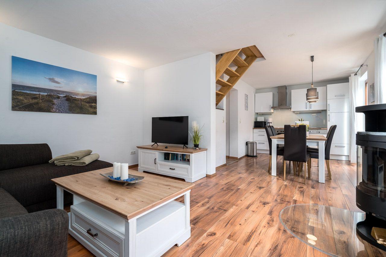 Das Ferienhaus/ Reihenhaus mit Süd- Terrasse, kleinem Garten, einem herrlichen Blick zum Hafen und nur 50 m vom Wasser entfernt, bietet auf 2 Ebenen und 4 Zimmern viel Platz zum Urlauben. Im gemütlich eingerichteten offenen Wohn- und Essbereich mit Kamin befinden sich ein Sofa, sowie Kabel-TV (SmartTV). Die offene Küche ist komplett ausgestattet mit Cerankochfeld, Backofen, Geschirrspüler, Kühlschrank mit TK-Fach, Kaffeemaschine, Mikrowelle, Toaster und Wasserkocher und alles was nötig ist. Von den 3 Schlafzimmern, befinden sich 2 im Obergeschoss (3 SZ mit Doppelbett), das Badezimmer mit bodengleicher Dusche im Erdgeschoss. Die Gartenmöbel und 1 Grill stehen zur Verfügung. 2 PKW Stellplätze befinden sich am Haus. Fliegengitter und Fußbodenheizung gehören ebenfalls zur Ausstattung. Die Stromkosten werden nach Verbrauch abgerechnet.