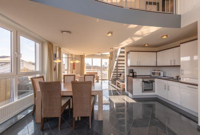 Das Apartment im 1. Obergeschoss im Müritzturm mit Blick auf die Müritz bietet Platz für bis zu 5 Personen mit 1 Schlafzimmer und offener Schlafgalerie, offenem Wohn-/Essbereich, Einbauküche, 2 Badezimmern, Balkon und PKW-Stellplatz. Für den perfekten Start in den Urlaub sind die Betten bei Anreise frisch bezogen und eine Erstausstattung Handtücher liegt bereit. Die Energiekosten sind im Mietpreis inklusive.