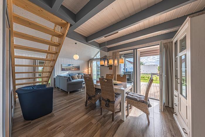 Das Ferienhaus im skandinavischen Stil bietet Platz für bis zu 6 Personen auf 2 Etagen mit 2 Schlafzimmern und offener Schlafgalerie, Wohn-/Essbereich, Einbauküche, Badezimmer mit Sauna und Whirlpool, Pkw-Stellplatz und Terrasse.