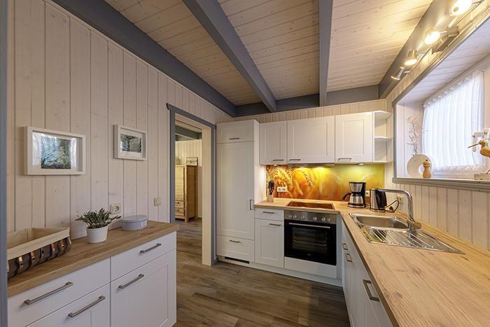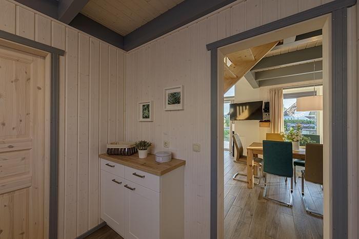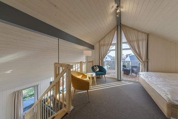 Das Ferienhaus im skandinavischen Stil bietet Platz für bis zu 6 Personen auf 2 Etagen mit 2 Schlafzimmern und offener Schlafgalerie, Wohn-/Essbereich, Einbauküche, Badezimmer mit Sauna und Whirlpool, Pkw-Stellplatz und Terrasse.