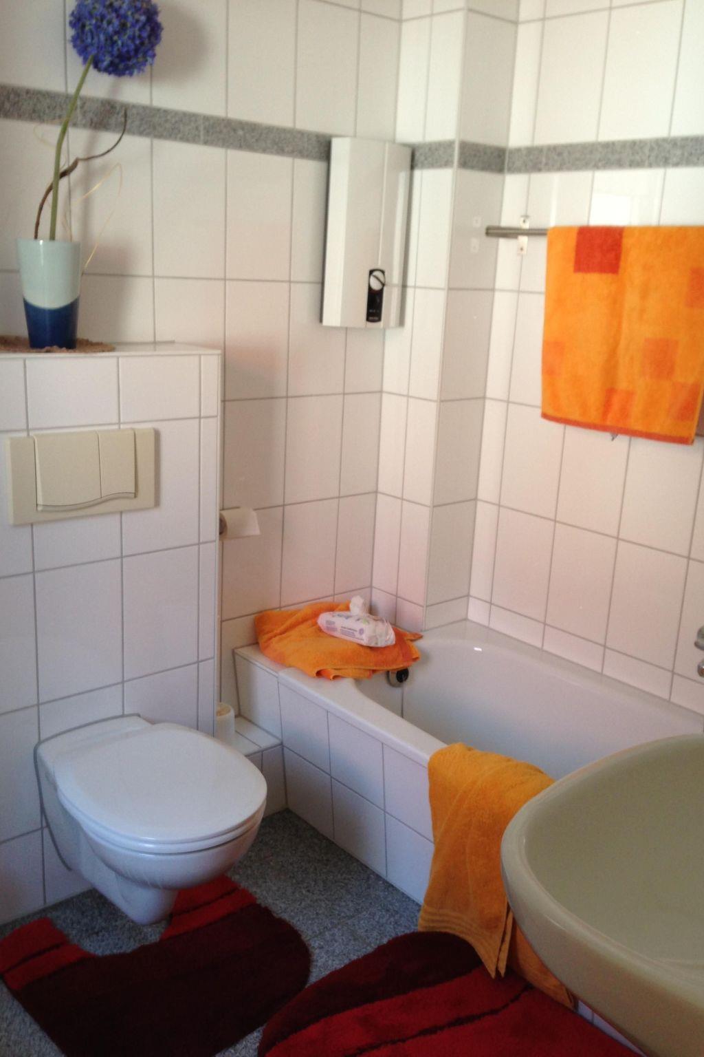 You enter the comfortably furnished holiday house into the hallway with a wardrobe. From here you can access the lower bathroom with an inset bath and WC. The living and dining room with an open kitchen is also on this floor, along with the built-in kitchen with an oven and ceramic hob, dishwasher, fridge with freezer compartment, radio, coffee machine, kettle, microwave, toaster, mixer and egg boiler. Next to the kitchen unit there is the dining table with six chairs. The living room provides a sofa suite, a rustic TV cupboard with satellite TV/DVD player and a radio/CD, as well as a modern fireplace. There are three bedrooms. One is downstairs, the other two in the attic. One bedroom upstairs has satellite TV/DVD player and a radio/CD. Stairs in the hallway lead to the upper floor. All three bedrooms are furnished with a double bed and a wardrobe. The second bathroom on the upper floor is fitted with a shower, WC and washing machine.