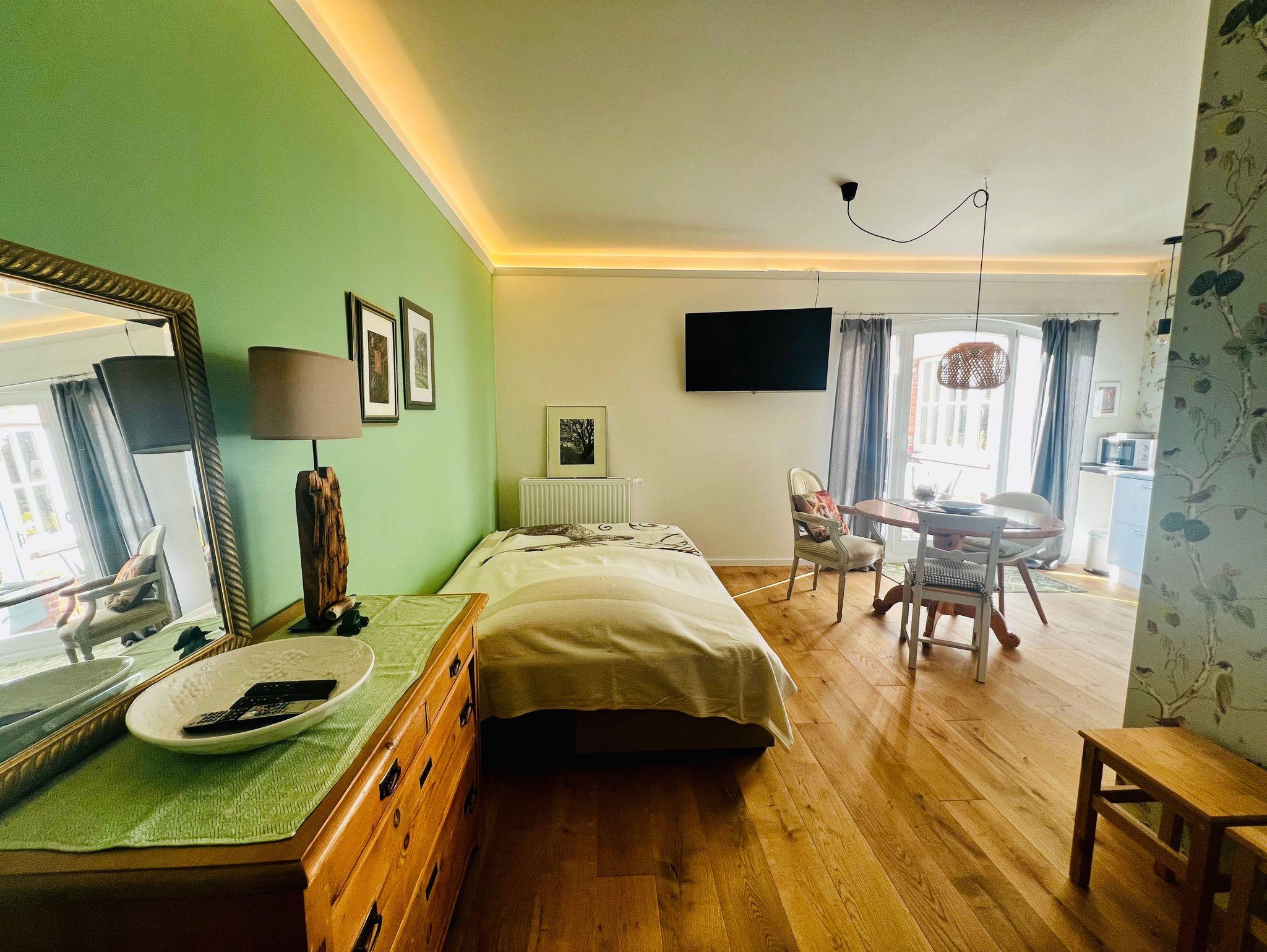 Das Apartment besticht durch seine helle, freundliche Gestaltung, einen offenen Wohn- und Schlafbereich sowie eine praktische Küchenzeile. Liebevolle Details, natürliche Materialien und eine moderne Ausstattung schaffen den idealen Rückzugsort nach erlebnisreichen Urlaubstagen.