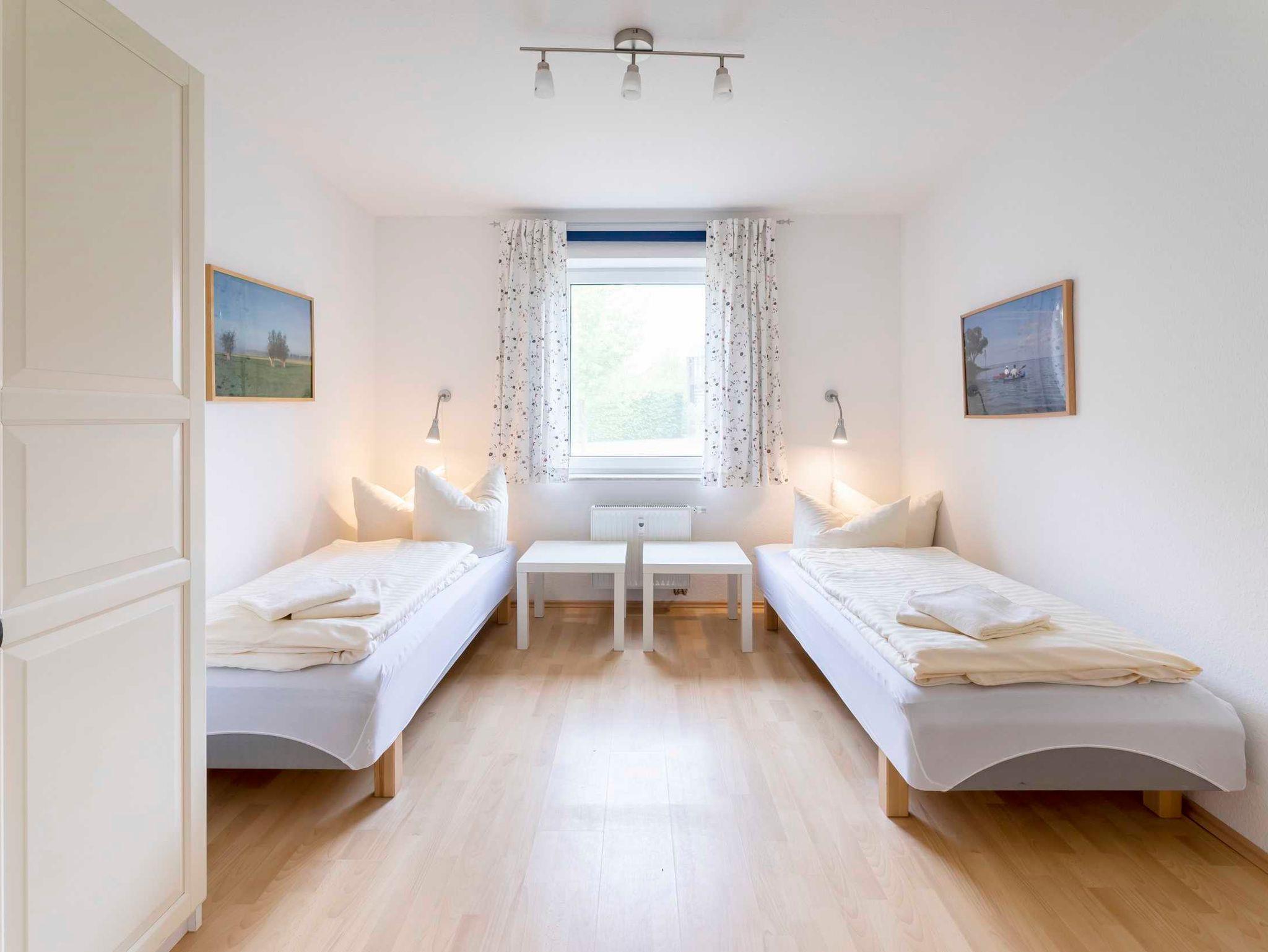 Die barierrefreie Ferienwohnung verfügt über ein Schlafzimmer mit 2 Einzelbetten. Eine zusätzliche Schlafcouch im Wohnzimmer bietet Platz für zwei weitere Personen.