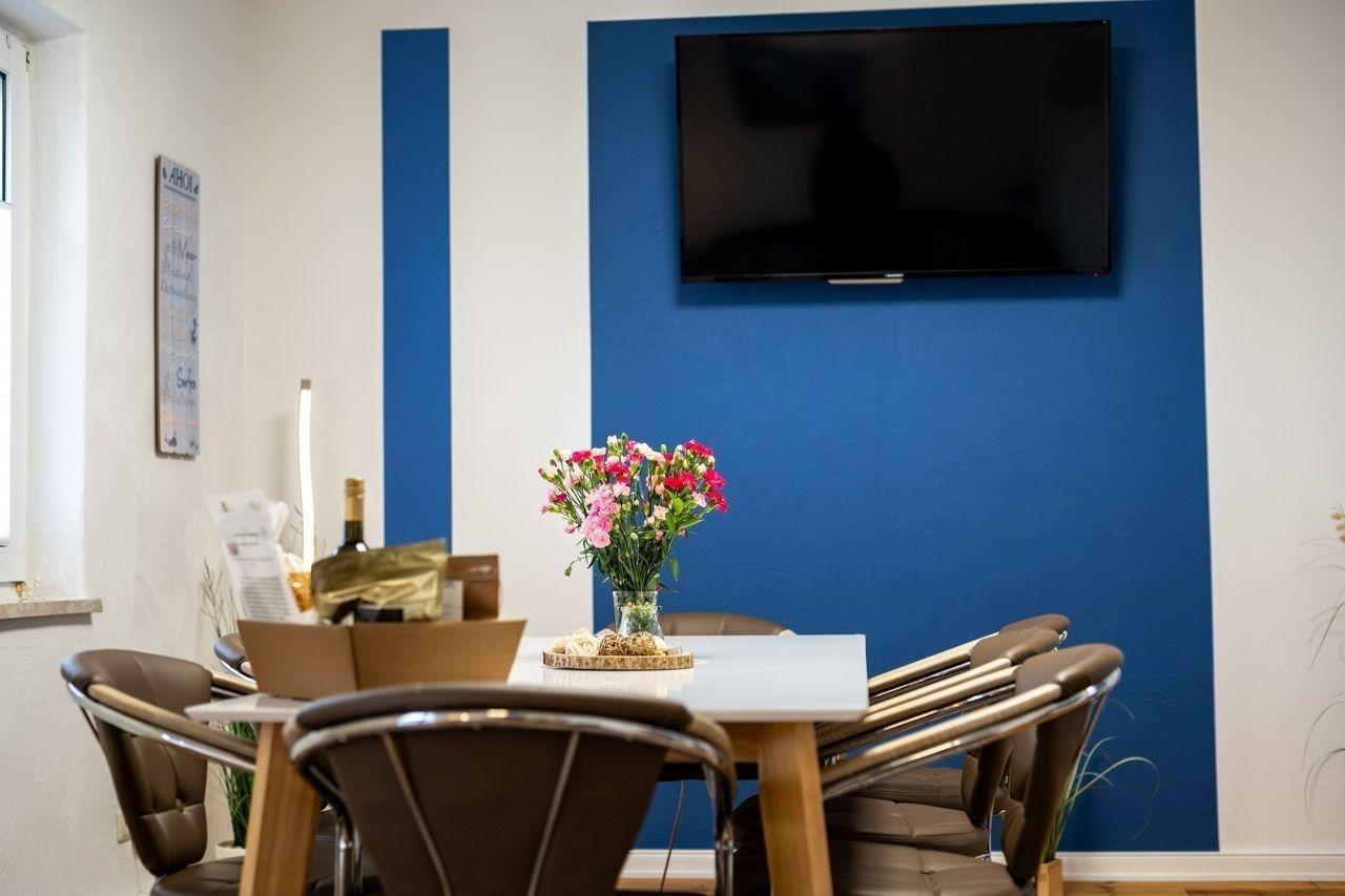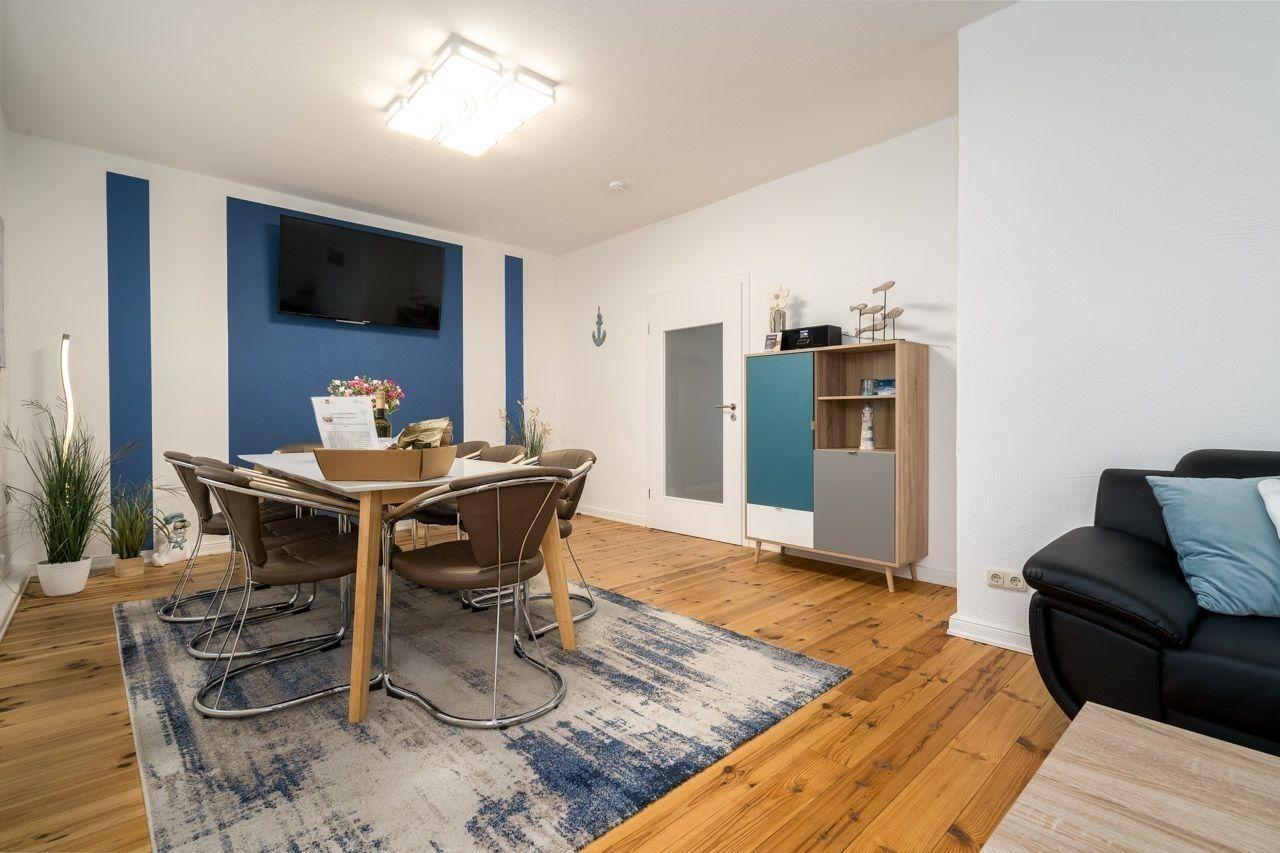 Die Ferienwohnung bietet großzügigen Raum für bis zu acht Personen und verfügt über vier Schlafzimmer, darunter drei Doppelbetten und zwei Einzelbetten. Die separate Küche ist voll ausgestattet mit Geschirrspüler, Elektro-/Gasherd, Backofen, Kühlschrank, Kaffeemaschine, Toaster und einem Starterset an Gewürzen. Ein modernes Duschbad mit Fenster, Haartrockner und kosmetischen Spiegeln sorgt für zusätzlichen Komfort. Die Wohnung ist allergikergeeignet und bietet Annehmlichkeiten wie WLAN-Internet, HiFi-Anlage, TV und viele Brettspiele für gesellige Abende. Ein Esstisch lädt zu gemeinsamen Mahlzeiten ein. Für Familien stehen ein Kinderhochstuhl und ein Kindertoilettensitz zur Verfügung. Praktische Extras wie Waschmaschine, Wäschetrockner und Parkplatz runden das Angebot ab. Entspannung wird durch eine Heizung, gemütliches Sofa und Bademäntel gewährleistet. Ein Treppenschutz und Fliegengitter sorgen für zusätzliche Sicherheit.