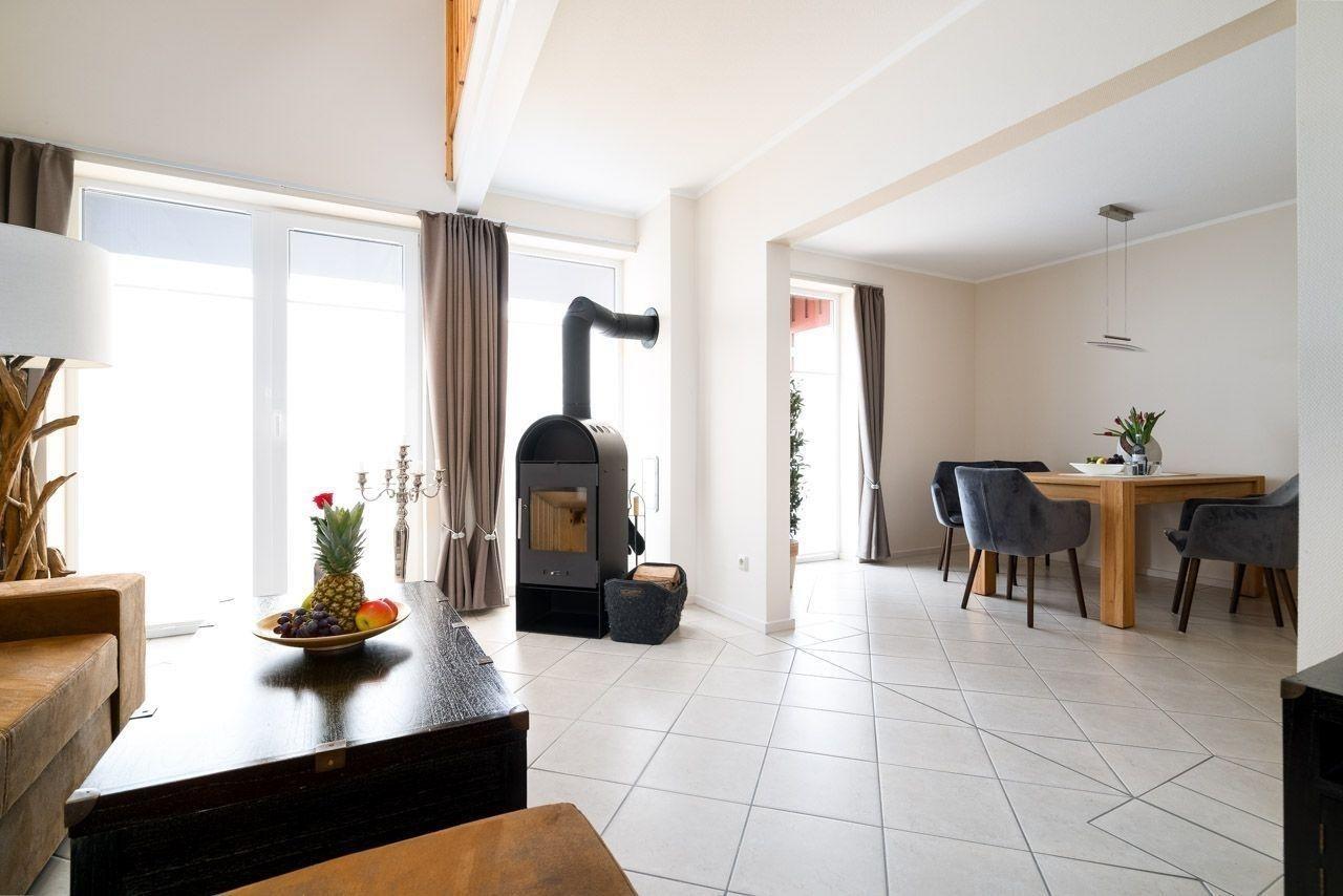 Die Ferienwohnung bietet großzügige Räume und eine moderne Ausstattung, die höchsten Komfort gewährleistet. Sie verfügt über zwei stilvoll eingerichtete Schlafzimmer mit jeweils einem Doppelbett, ideal für erholsame Nächte. In der offenen Küche finden sich zahlreiche Annehmlichkeiten wie ein Geschirrspüler, Elektro-/Gasherd, Backofen, Mikrowelle und Kühlschrank, ergänzt durch eine Kaffeemaschine und einen Toaster. Die Wohnung ist allergikergeeignet und bietet mit zwei Badezimmern, einem davon mit Badewanne, ausreichend Platz für Entspannung. Für Gemütlichkeit sorgt der Kamin oder Kachelofen im Wohnbereich, der auch mit einer HiFi-Anlage und TV ausgestattet ist. Eine Fußbodenheizung, Duschbad mit Haartrockner sowie zahlreiche Handwerkszeuge wie Bügeleisen und Staubsauger erhöhen den Wohnkomfort. Parkmöglichkeiten sind ebenfalls vorhanden. Ideal für Familien oder Paare, die Wert auf Raum und Komfort legen.
